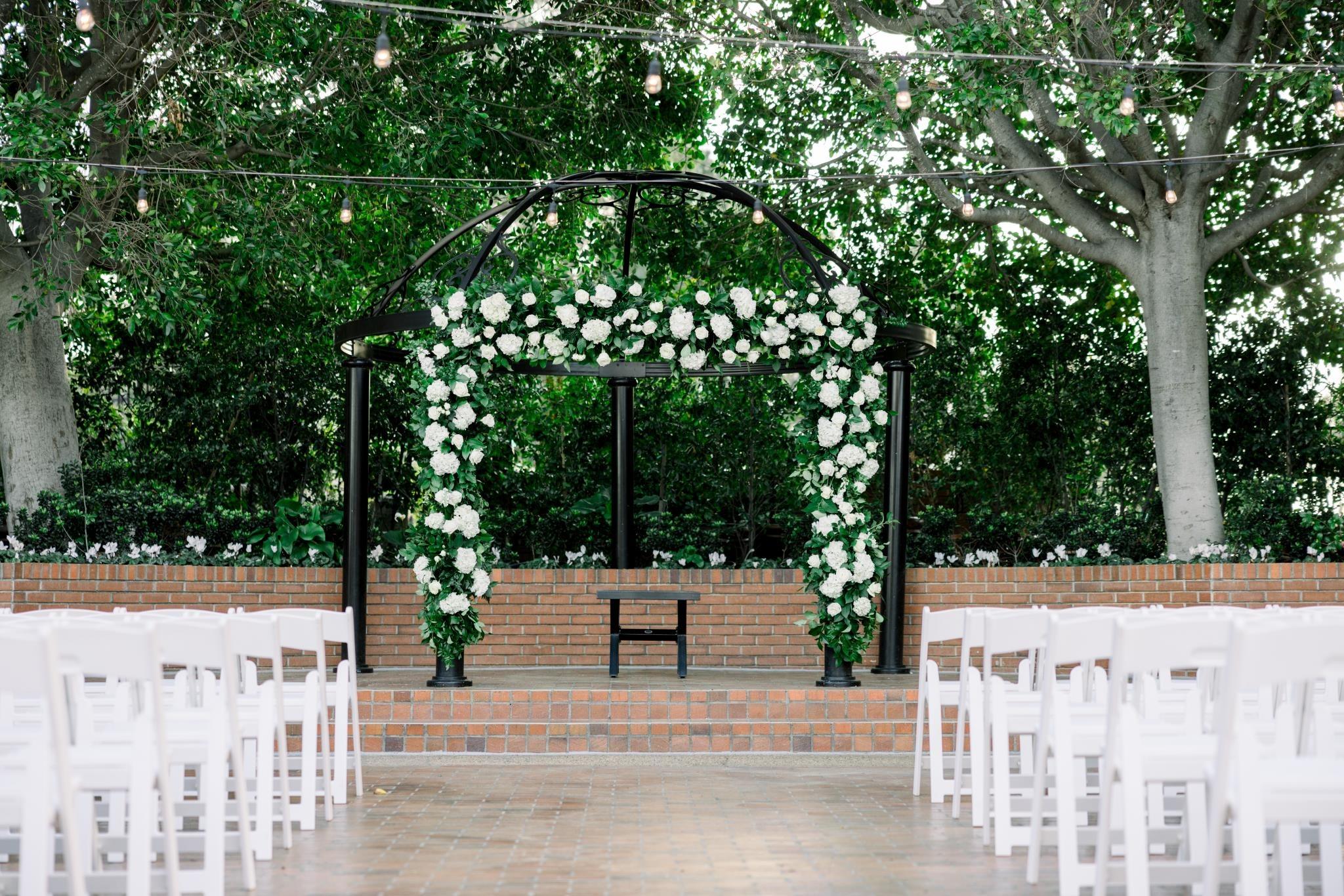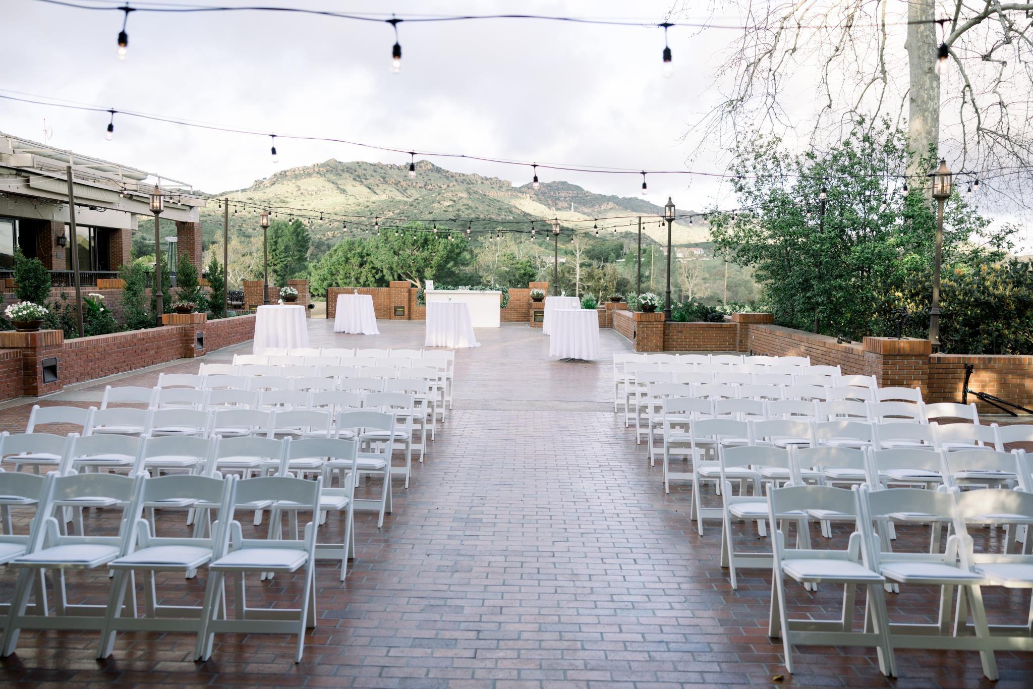Our enchanting Ceremony Patio is a picturesque setting that can comfortably host up to 330 guests. Framed by the natural beauty of Simi Peak Mountains and lush greenery, this open-air space exudes a serene and romantic ambiance. The patio is lined with classic red brick that harmonizes with the natural environment and breathtaking backdrop. Strands of delicate lights are strung overhead, adding a soft, fairy-tale glow that transitions seamlessly from day to evening festivities.