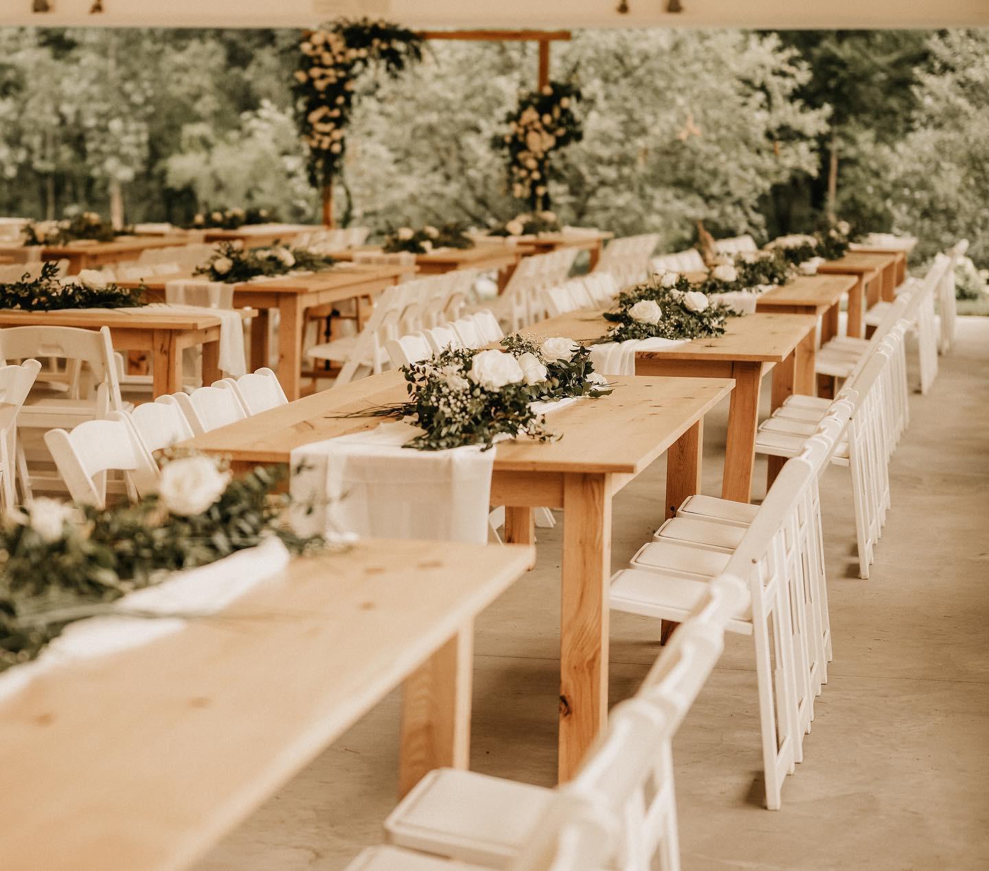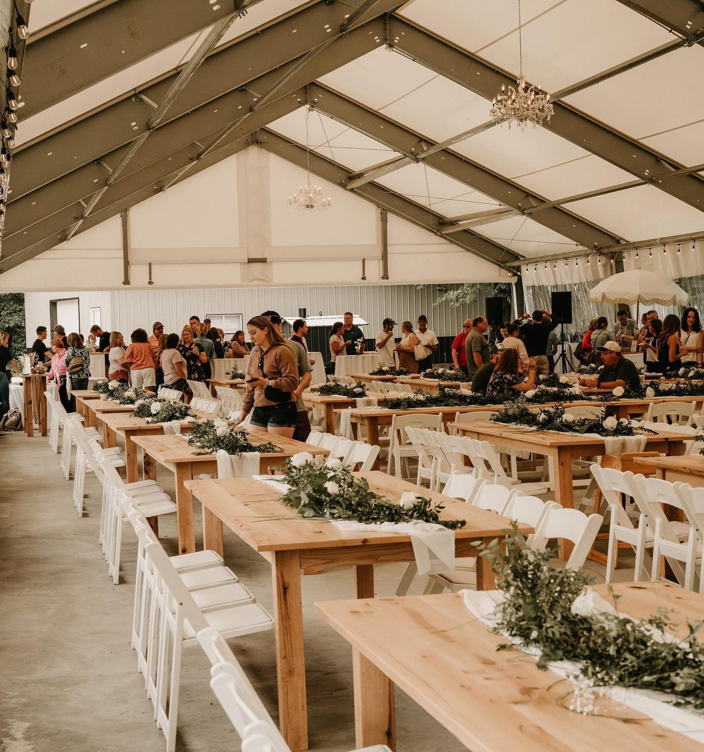 This 4,800 square foot space features 3 chandeliers, handmade 8' long and extra wide tables, garden style chairs for up to 299 guests, and so much more! Work with our team to make this space yours!