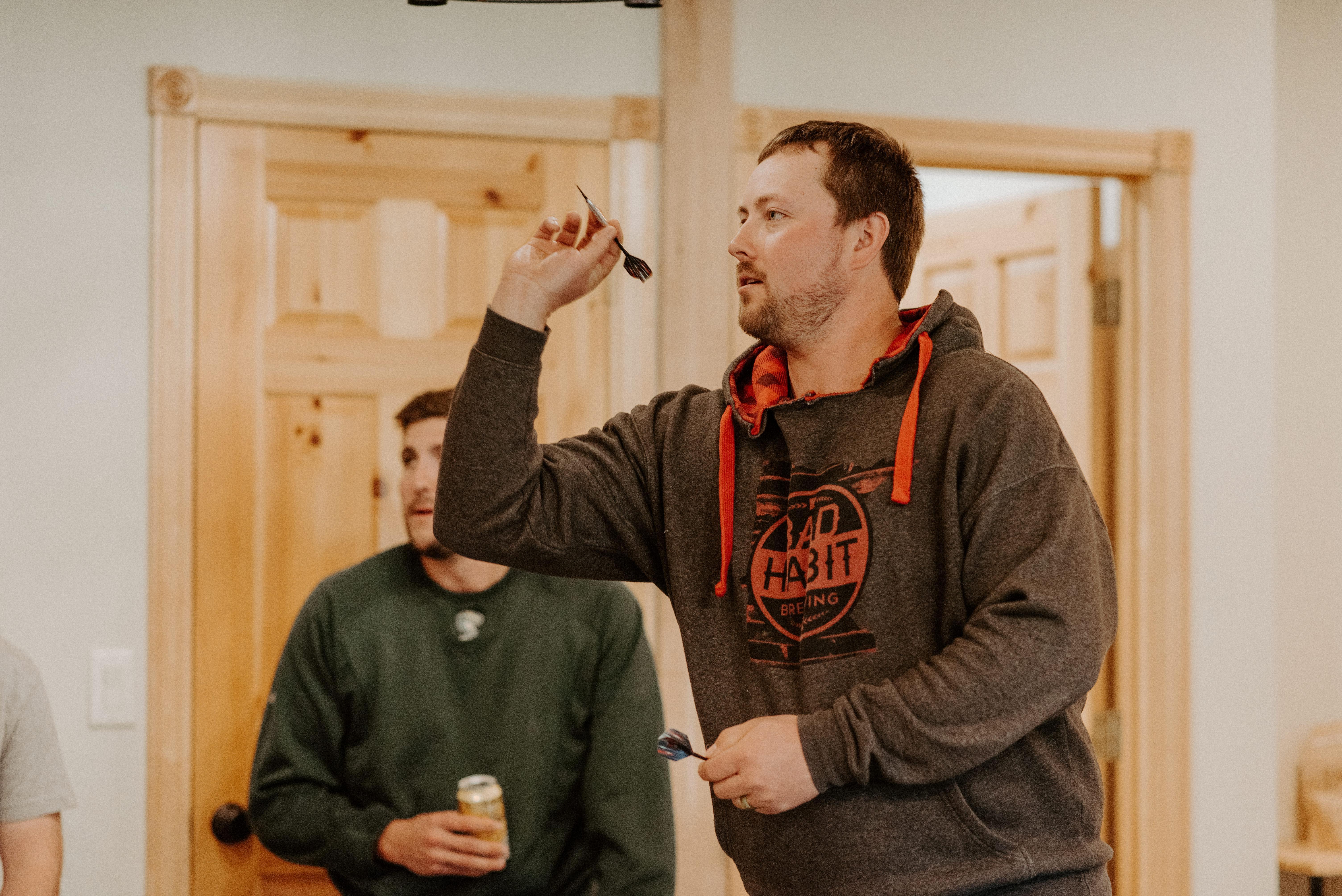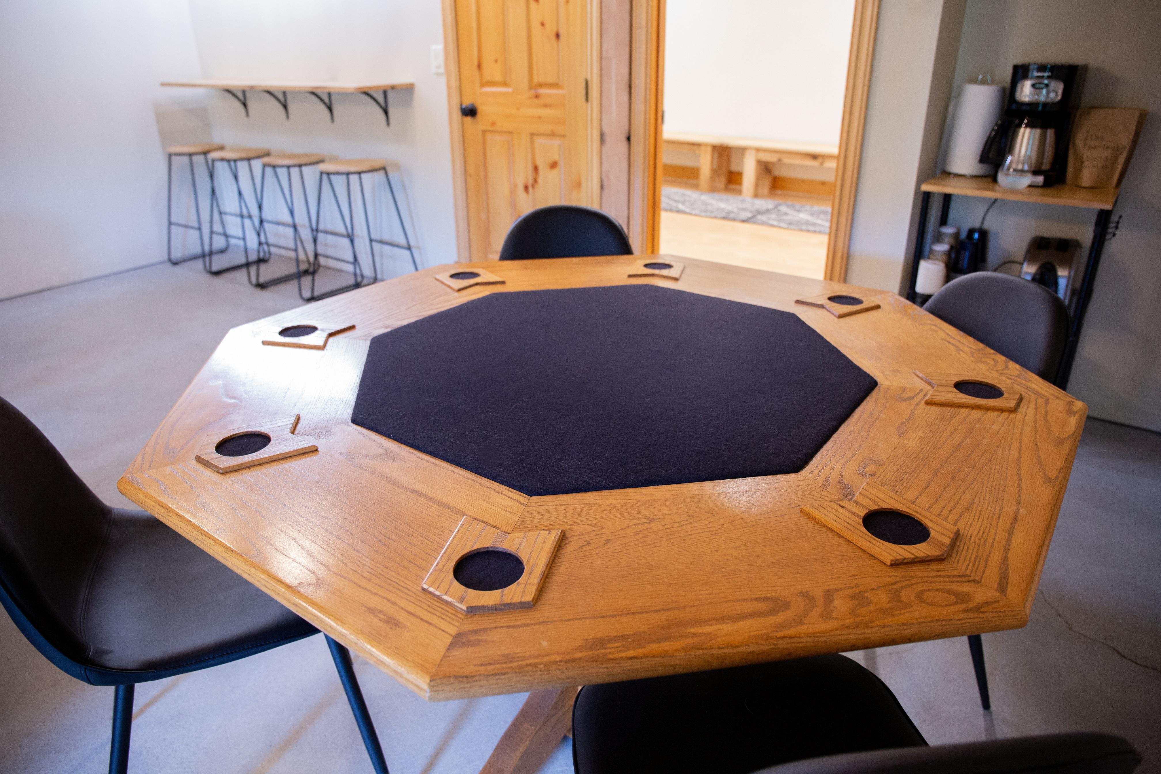 This renovated space features a card table, tv, dart board, changing room, restroom, fridges and access to outside!