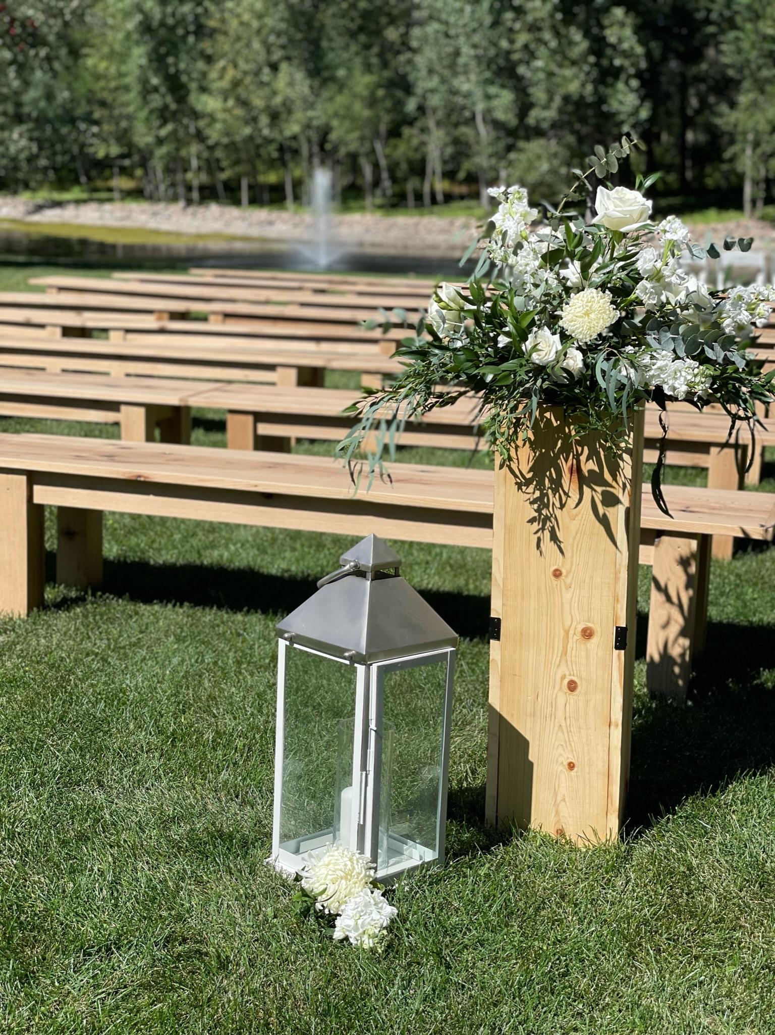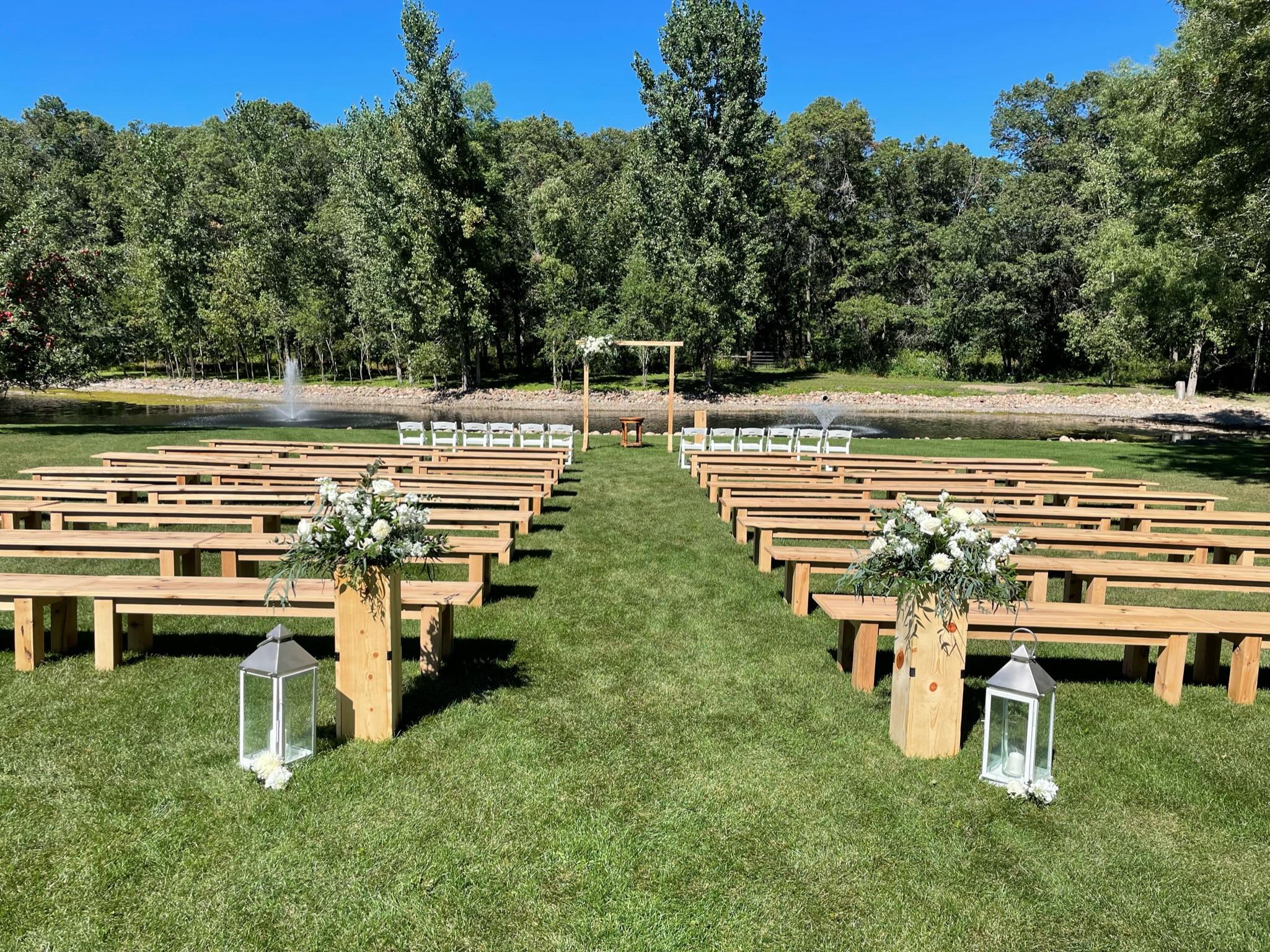 Choose from our two ceremony options featuring handmade benches! You can also utilize our wooden arch to be married under. The back highlights our pond with fountains and the front provides a natural stone arch.