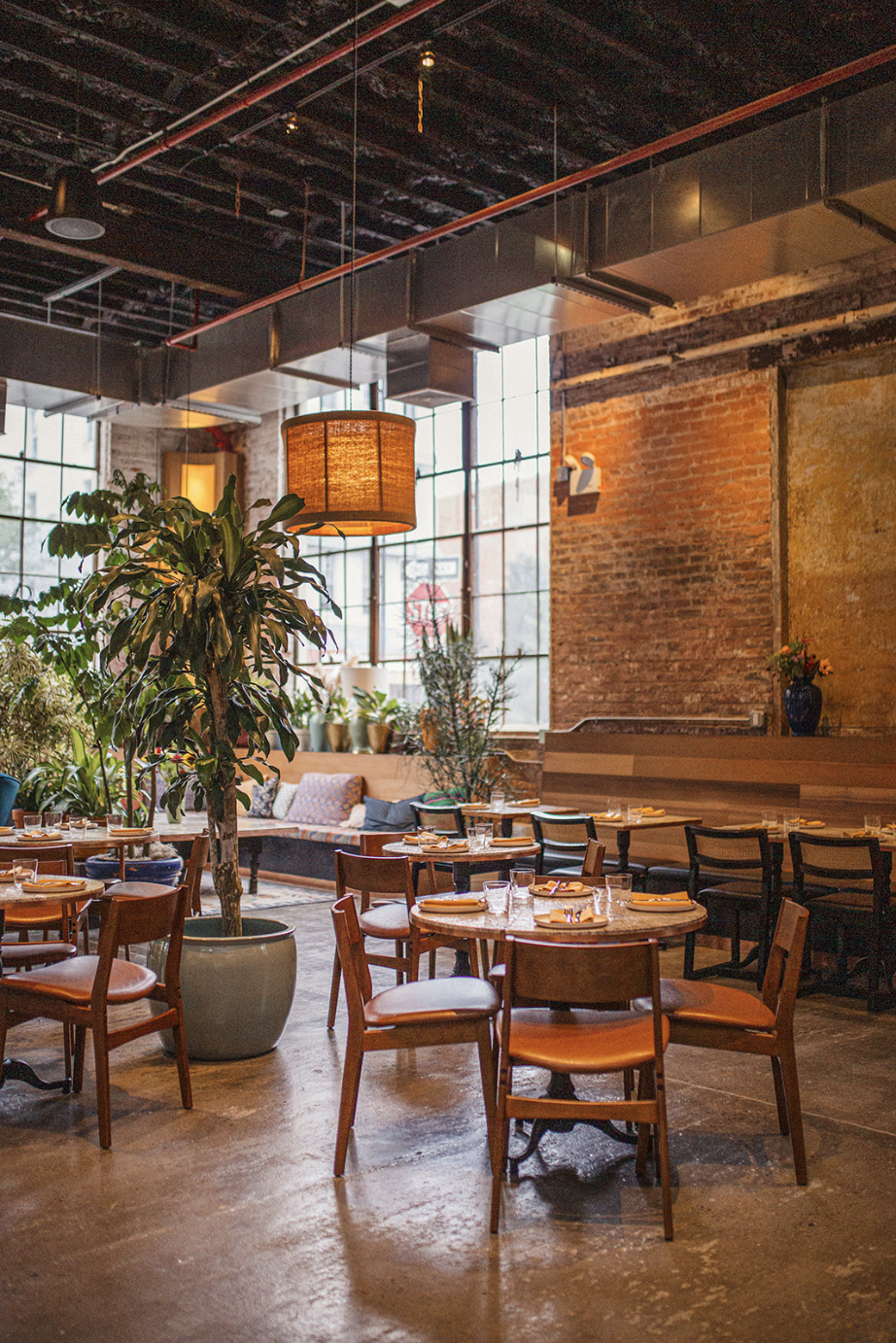 This Greenpoint restaurant and wedding venue sits inside a former auto body shop, transformed into a soaring, plant-filled space with high ceilings, a dramatic skylight, and a striking central bar. Despite its size, the venue has a warm, romantic atmosphere that evokes a sense of nostalgia, especially as the soft glow of the sunset pours through its expansive windows each evening. Spacious yet inviting, it’s an ideal setting for large celebrations, offering a welcoming ambiance perfect for weddings and memorable events.