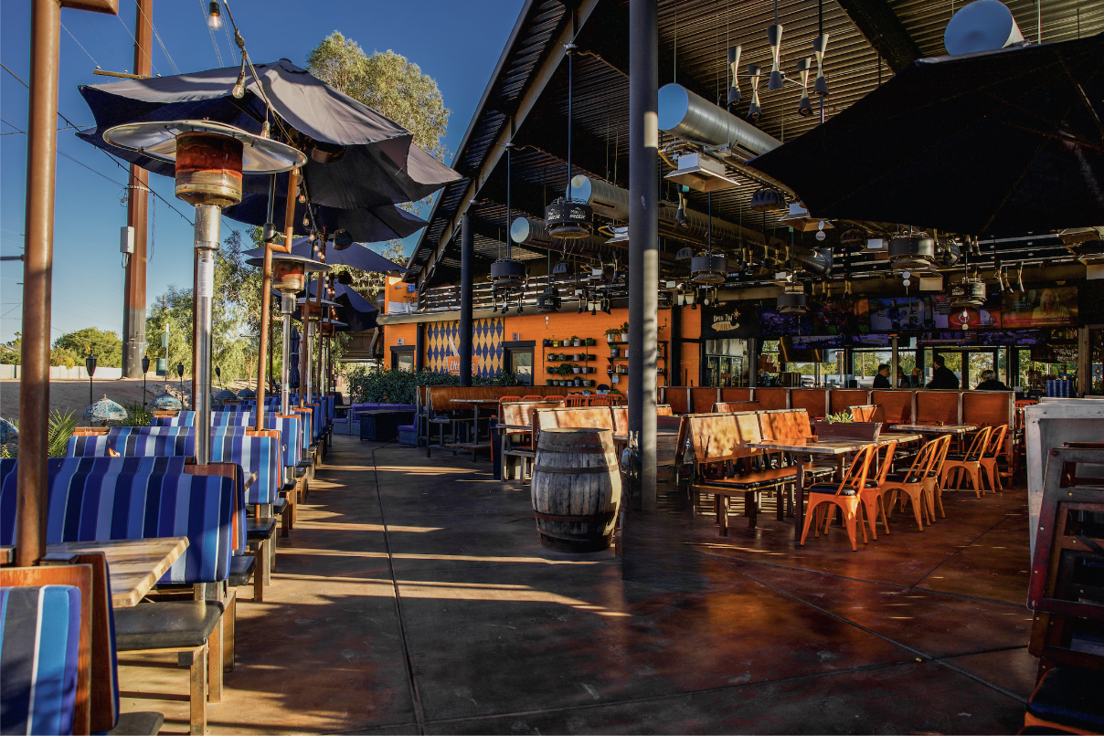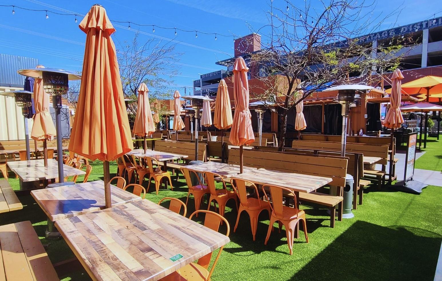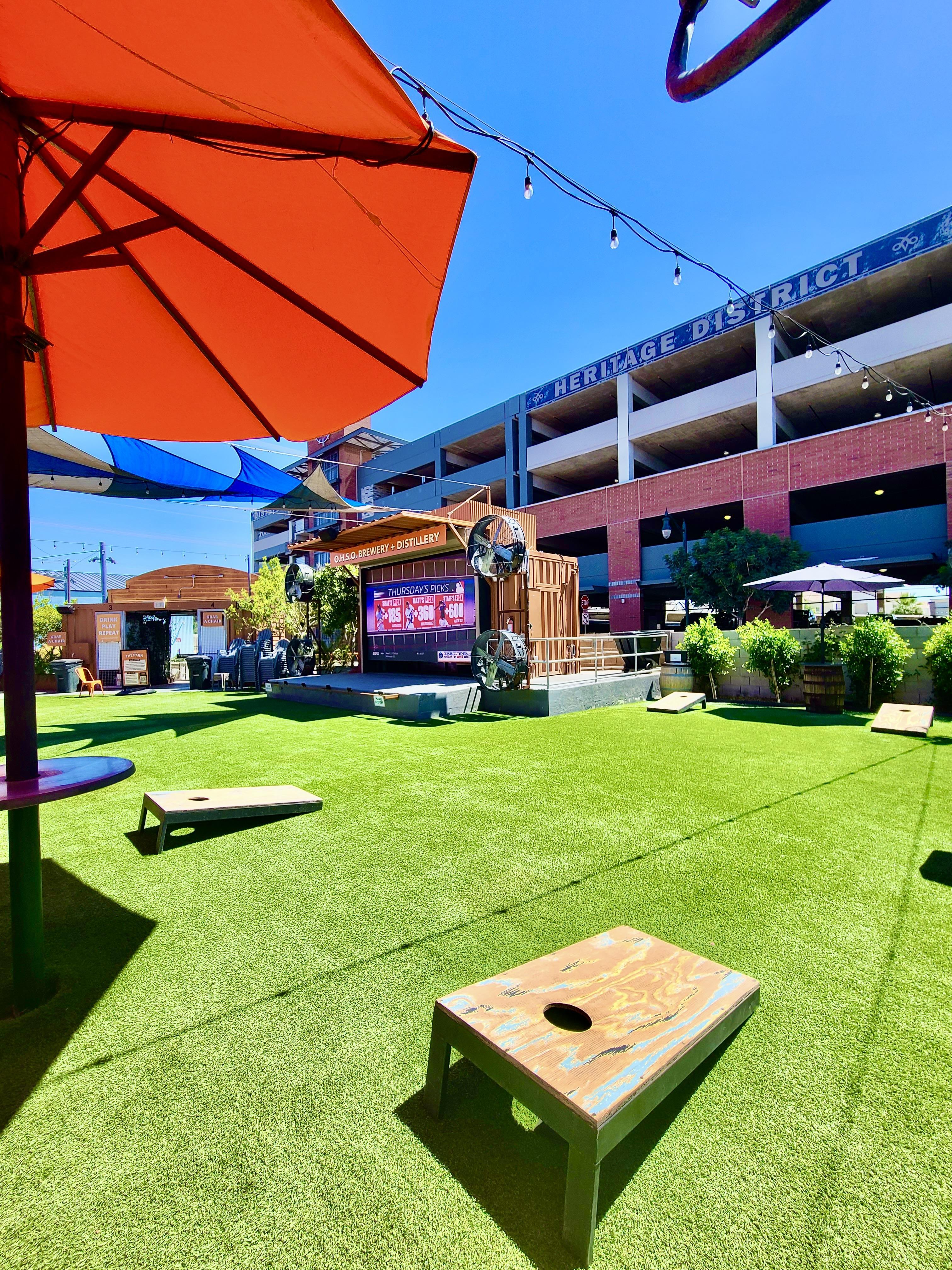 Our Downtown Gilbert location has the best patio in town. We’re talking about a full-on park with games, a full bar, and even an enclosed dog park—all just behind our two-story brewery and restaurant. Bring the whole family to enjoy a burger inside our brewery, then head to the park to play a lawn game or listen to live music. We have a full bar and an enormous T.V. screen so you can enjoy your favorite sporting event or movie from the comfort of a picnic blanket.