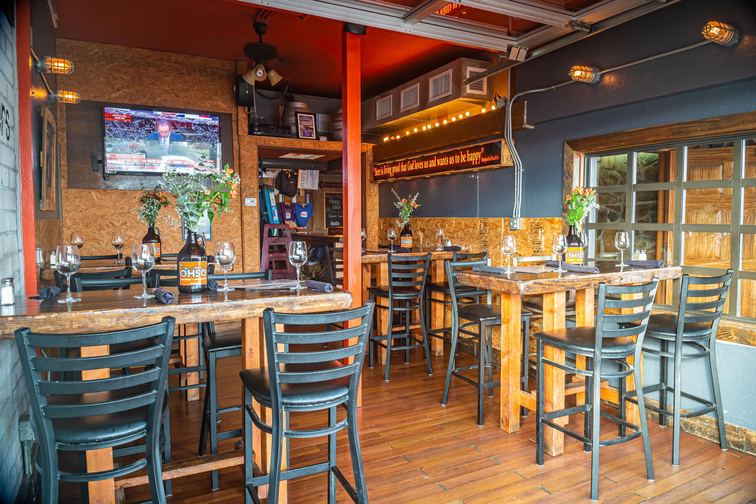 - Bar - Wood top tables - Chairs - Wall mounted TV's - In-house music system - Central heat and A/C, Wifi access throughout the space - Barrel Chandeliers - ADA Accessible