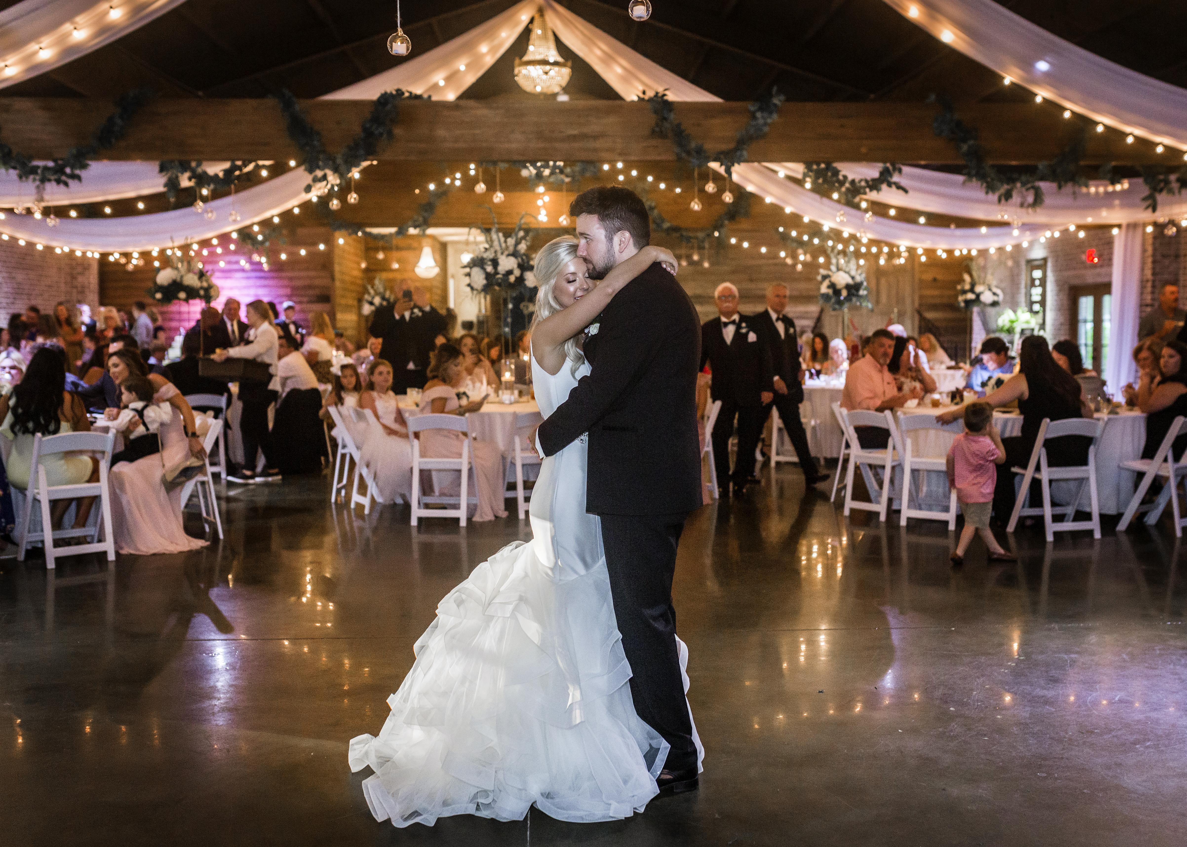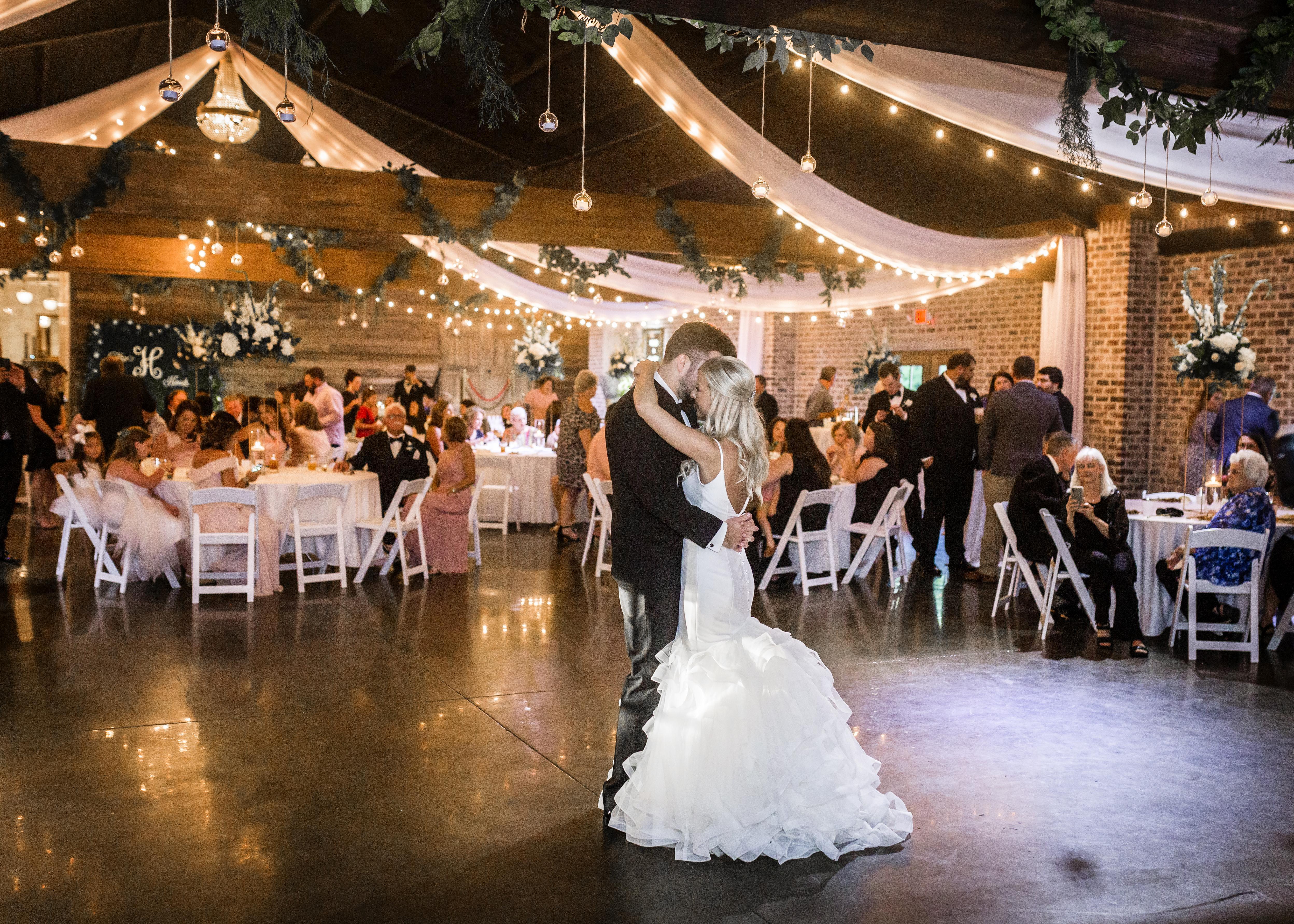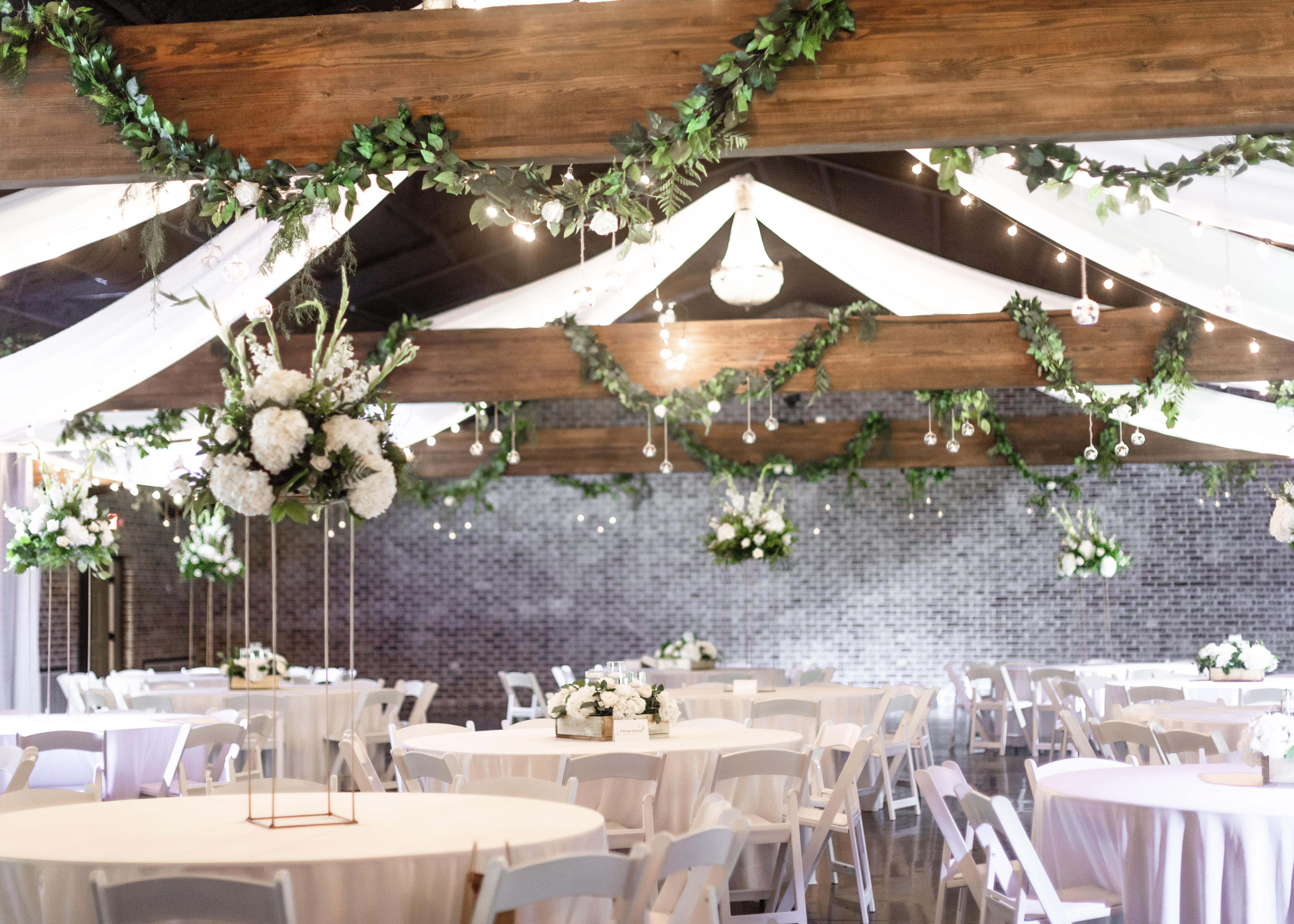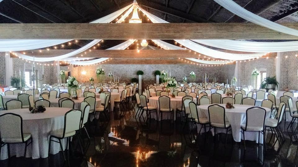 This banquet hall space is 6,700 sq. ft. It is drape with white drapery and string lights, along with antique chandeliers. You can decorate as little or as much as you want. It's up to you. Your able to make your wedding day dream come true, here at Oak Hill Estate.