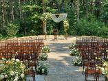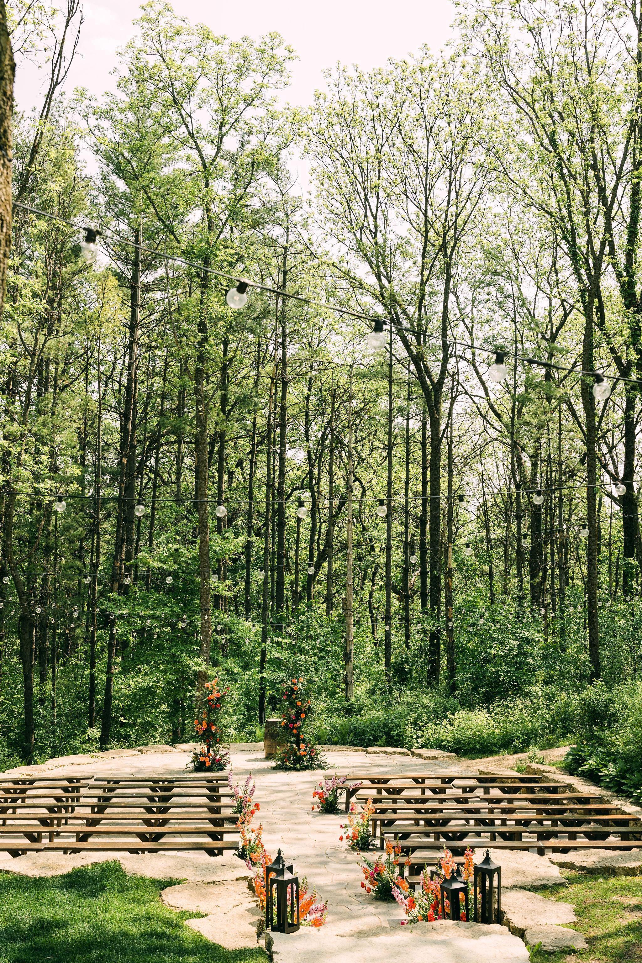 A serene ceremony space nestled beneath tall walnut trees, where dappled light and natural beauty create an intimate, timeless setting
