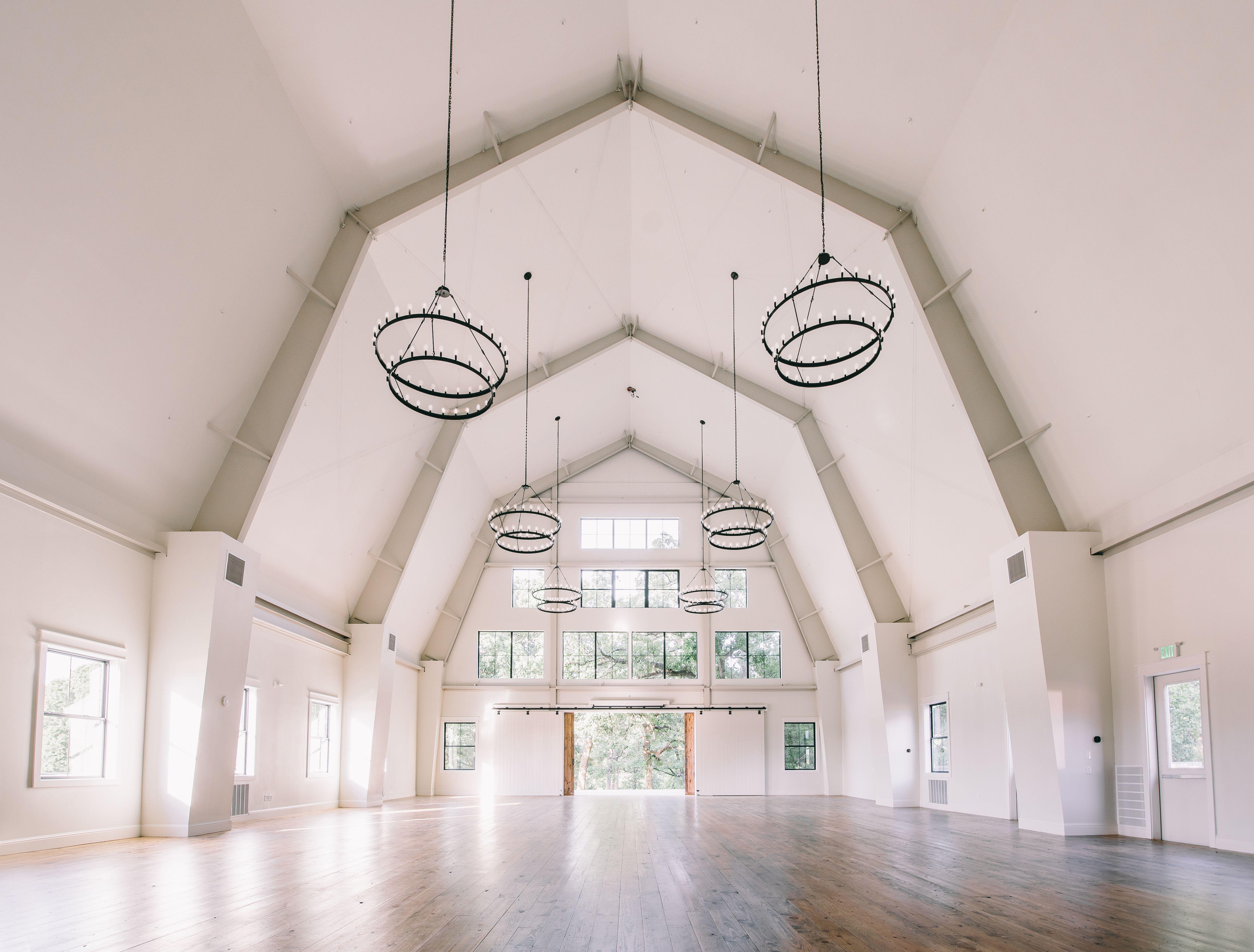 This space is 3,500 square feet - wide open to any design the bride and her planner want to do. There are large windows that let the expansive exterior in. The barn doors open to the 4 acres of oak trees and on a beautiful day these doors can be left open to let the outdoors in.