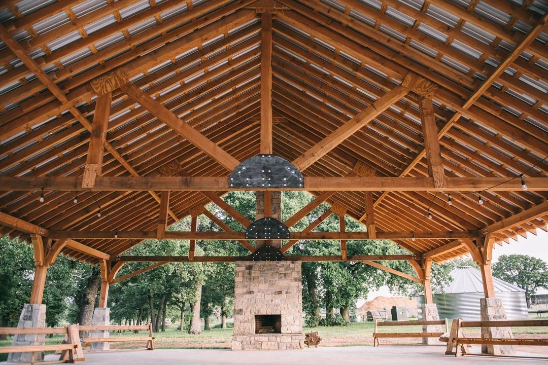 This space allows everyone to be outside and yet undercover. It is spacious and looks out over the 4 acres of mature oaks. It has a wood burning fireplace - perfect for warmth and S'mores and plenty of room for a ceremony or cocktail hour.