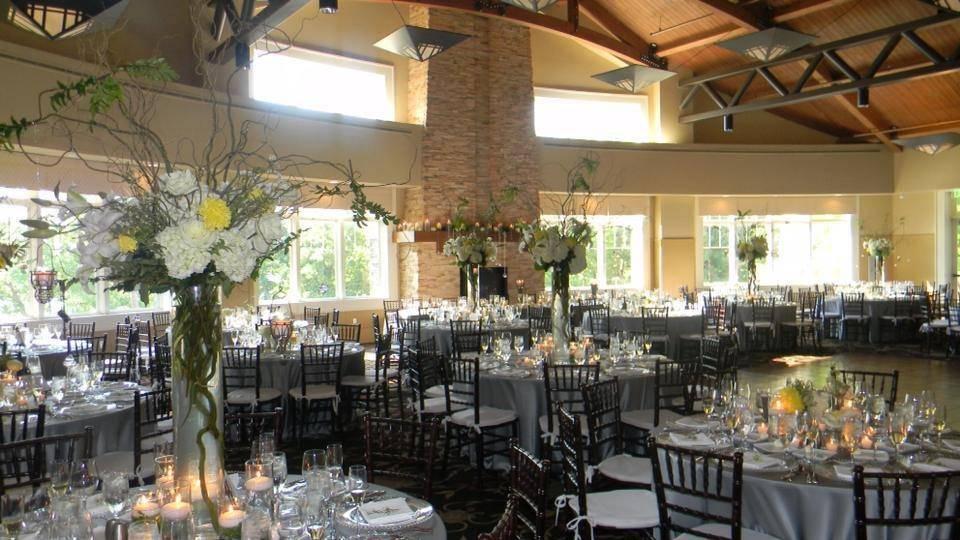 The indoor aesthetic is contemporary and elegant, featuring a stone fireplace, modern overhanging light fixtures, and white walls to accommodate a variety of themes and color schemes. The peaked wood ceiling helps to heighten the atmosphere, and there are plenty of windows affording impressive views of the course. We offer four private dining rooms and a covered outdoor patio for receptions, cocktail hours, and more.