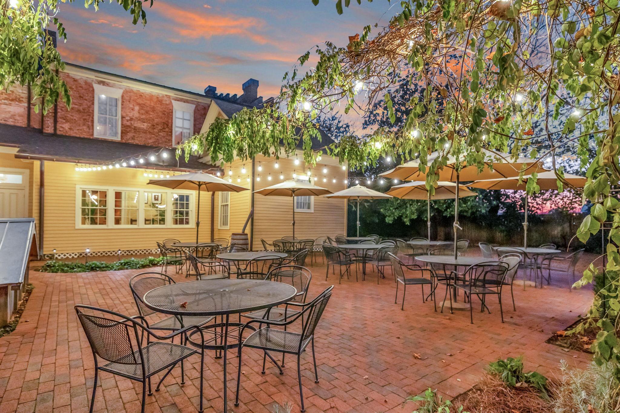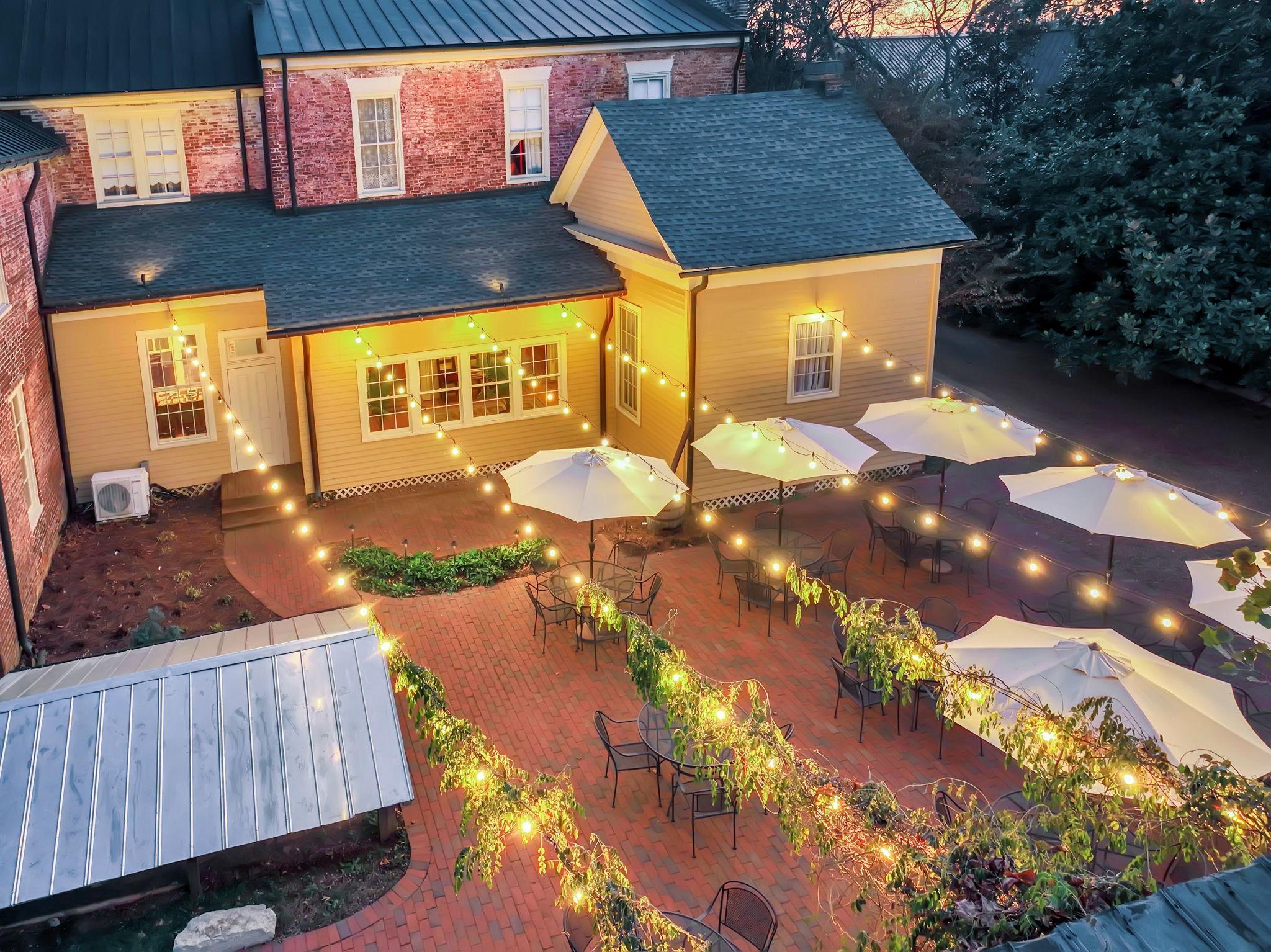 This space features a rustic garden shed and bistro lights surrounded by manicured shrubs and flowers. Sitting just behind the historic home, guests can enjoy the beautiful garden beds and admire the grand architecture of the Oaklands Mansion.