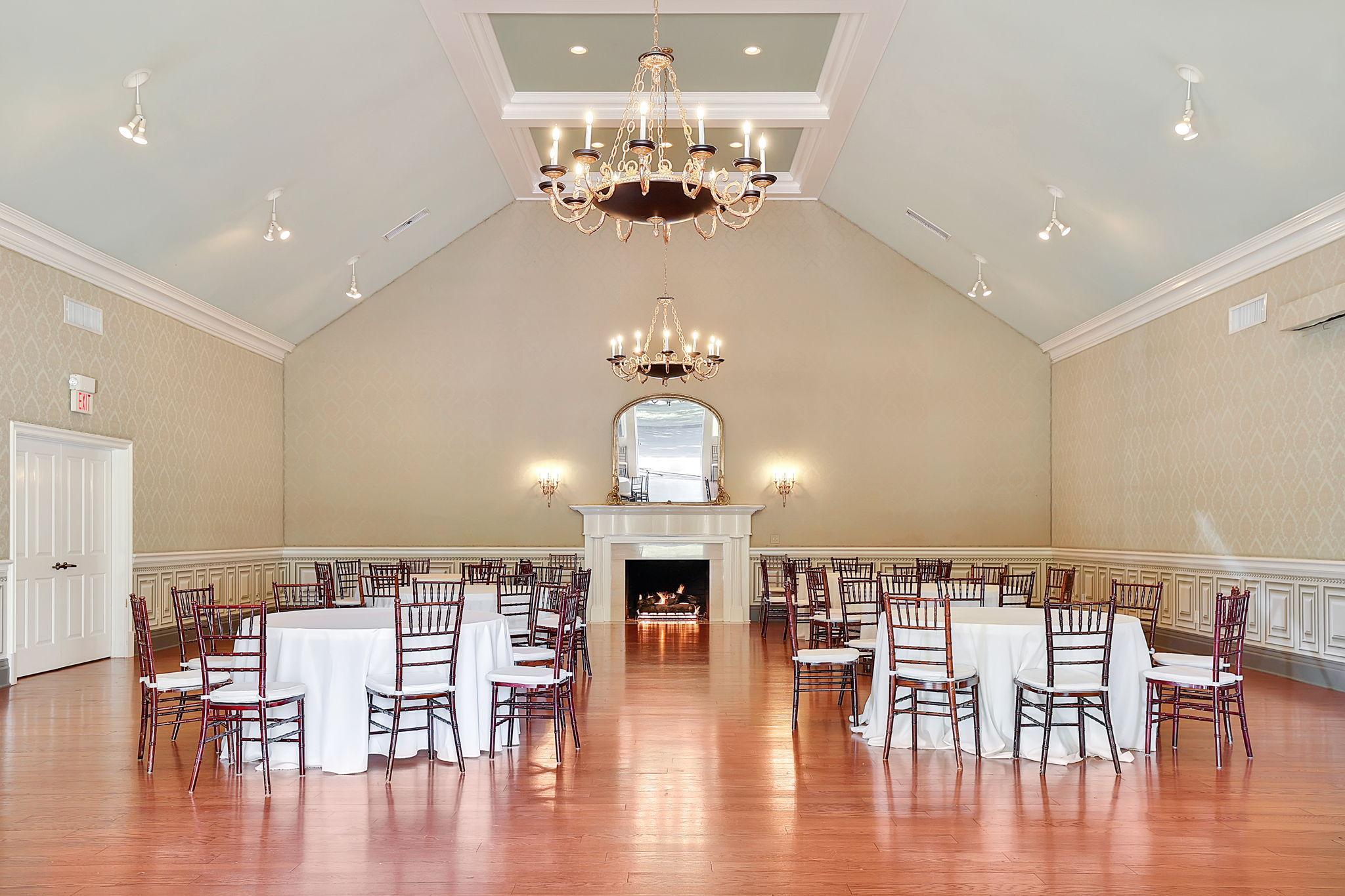 This 1,600 square foot reception hall features two large Victorian inspired chandeliers with a high vaulted ceiling, a working gas fireplace and attached catering kitchen.