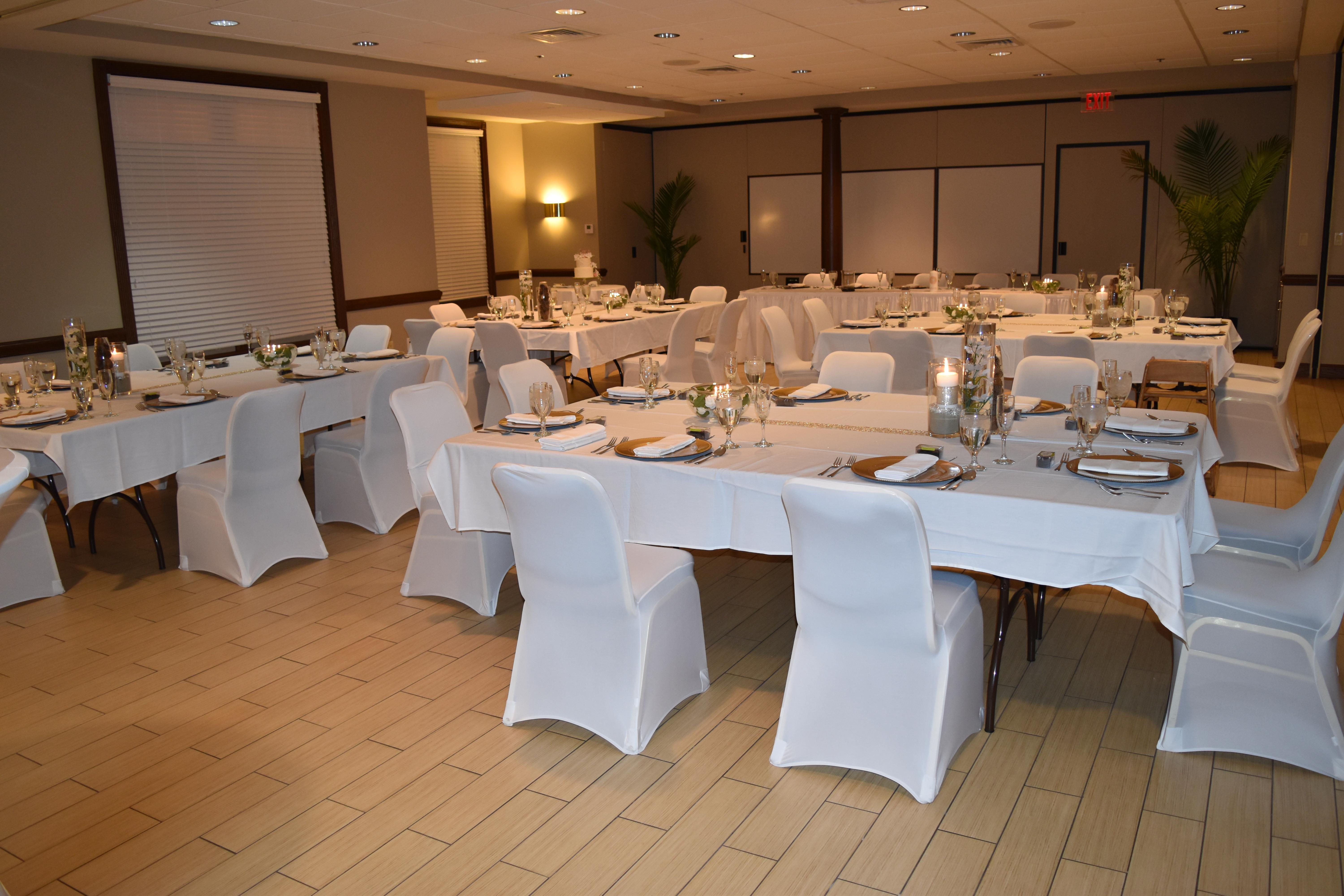 Conveniently located inside of our hotel, our conference rooms can accommodate 10-100 guests for a small wedding! Air walls gives this space the ability to be one room, two rooms, three rooms or four! Our conference rooms are also perfect for bridal showers, rehearsal dinners, or post-wedding brunches!