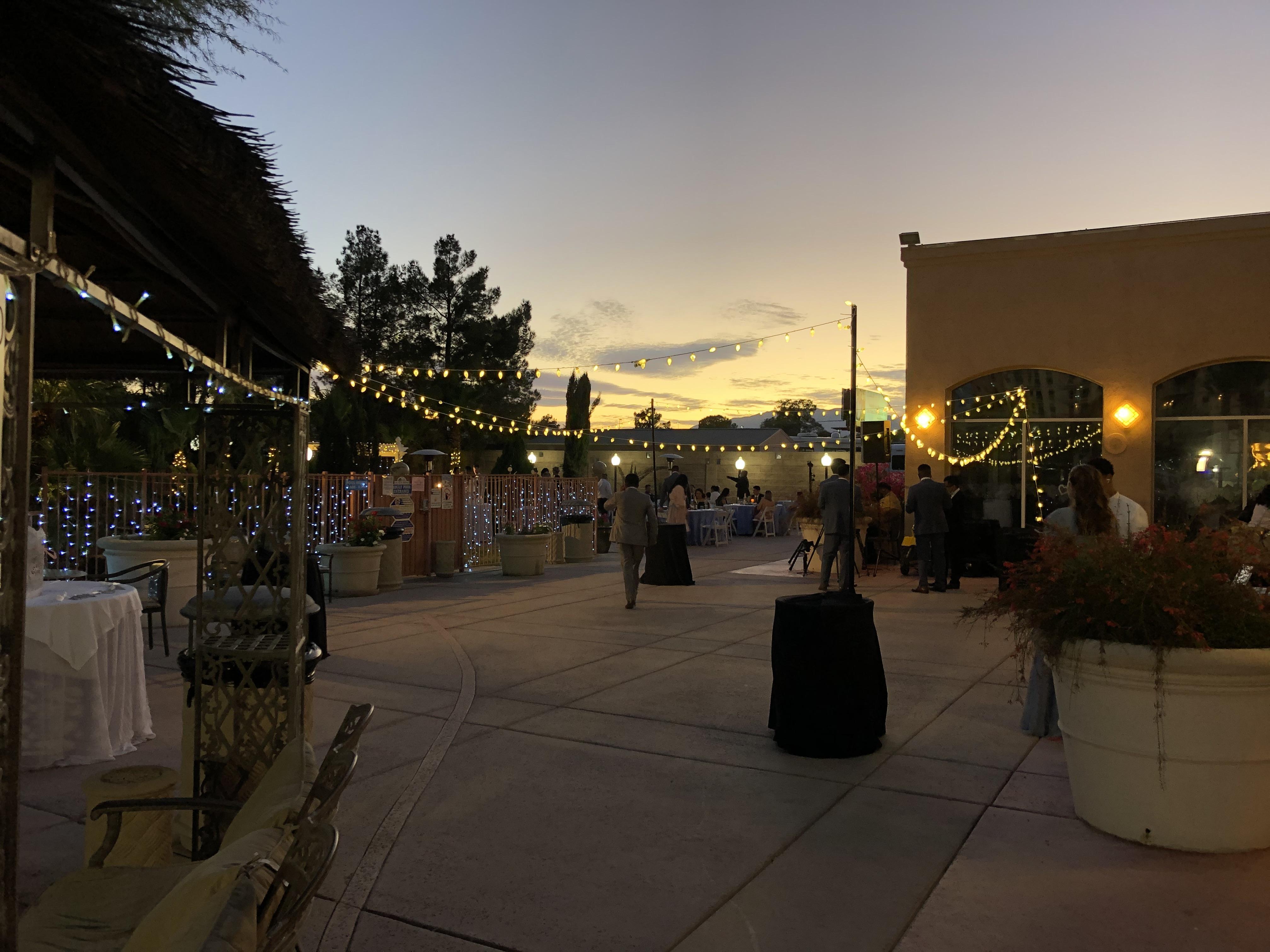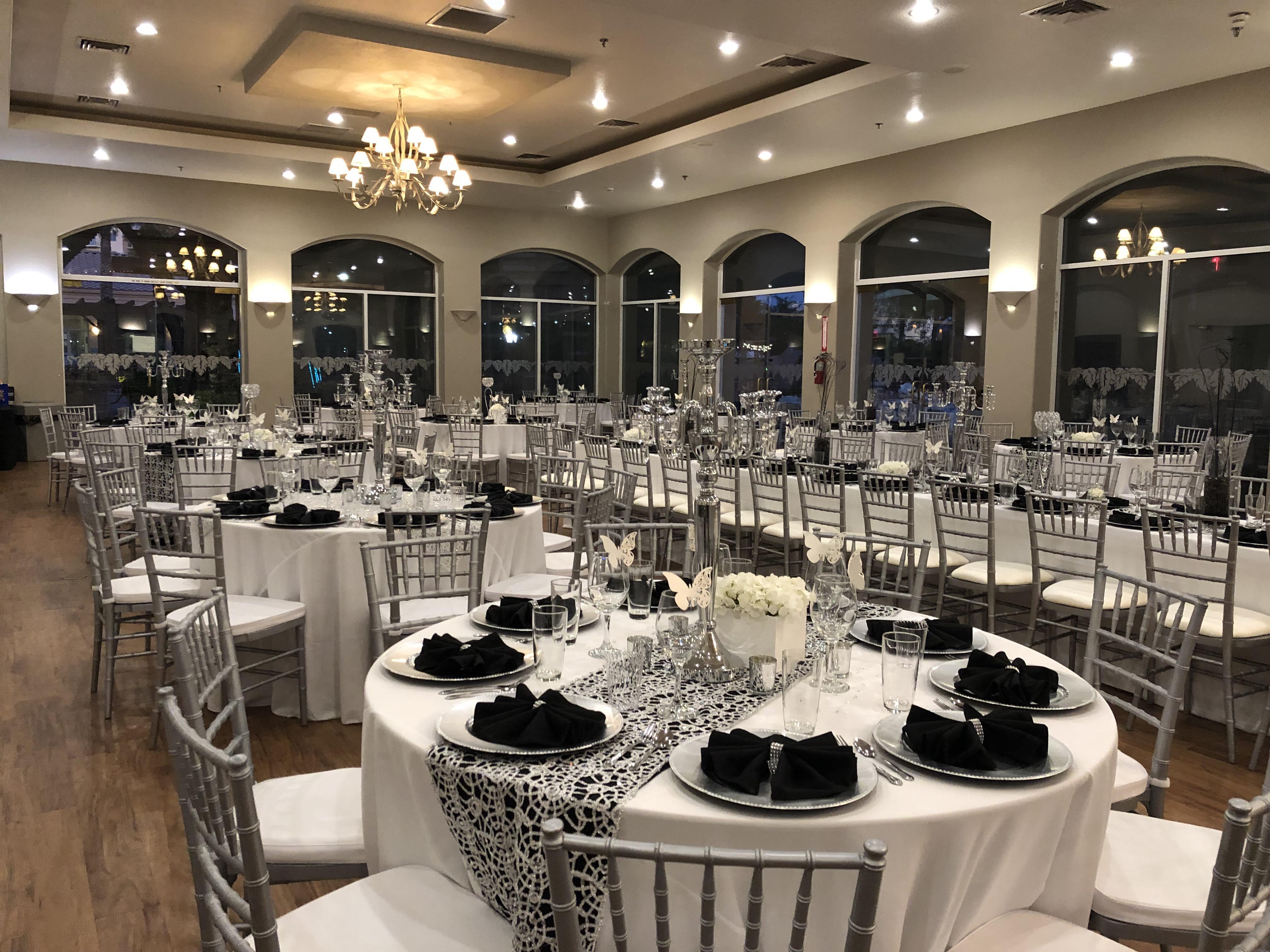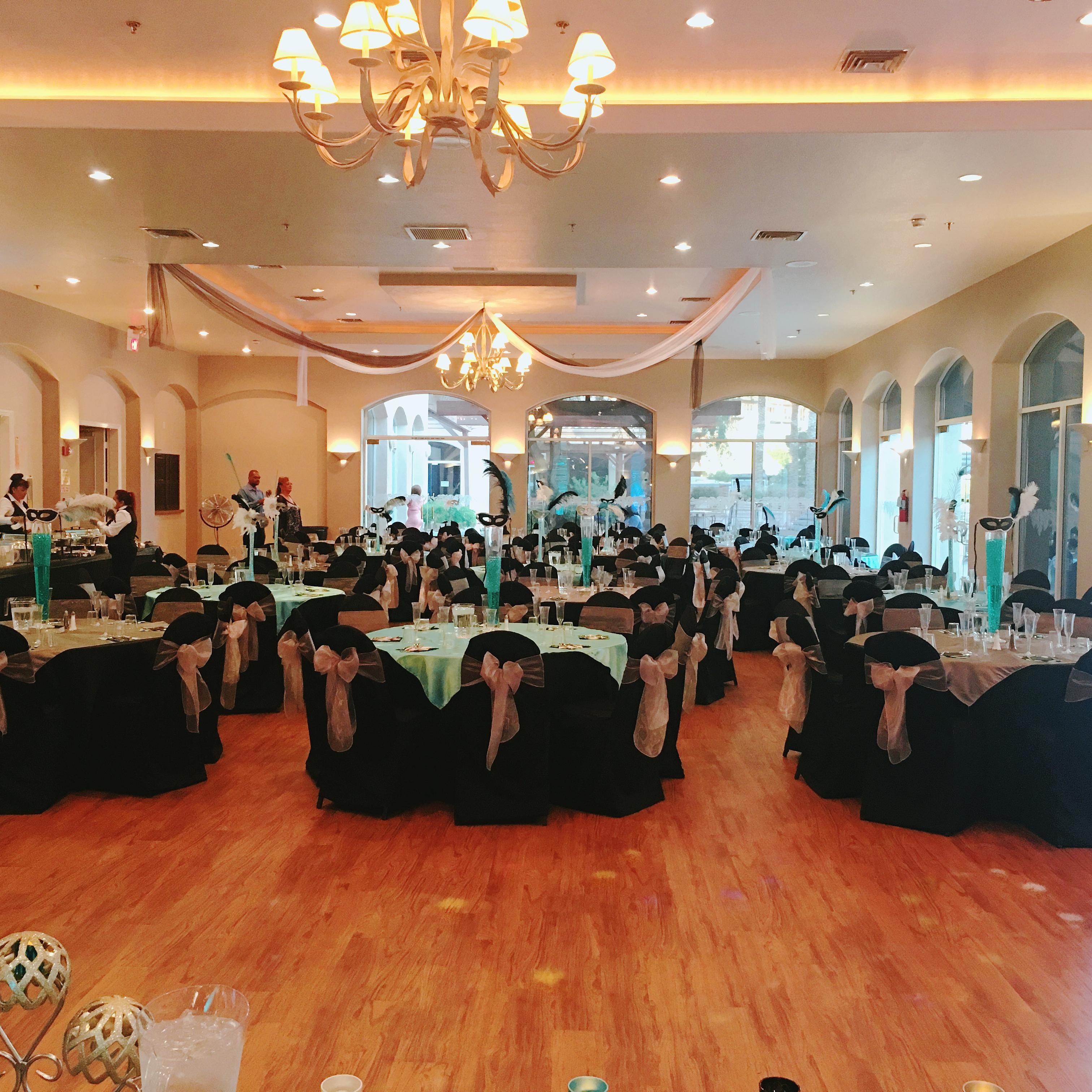 Discover the Hidden Oasis of Las Vegas Our elegant ballroom can host up to 250 guests comfortably. Events in the ballroom have exclusive use of the patio area (over 2,000 ft. of patio space) so guests may enjoy over 6,000 sq. ft. of indoor/outdoor space in the sunny Las Vegas weather. For smaller, more intimate events, we are happy to offer the Hollywood Room. Our Hollywood Room comfortably accommodates up to 50 guests. In addition, we have a beautiful wedding garden surrounded by palm trees and roses. You can choose from our vendor partner or D.I.Y. Since Oasis now have its own liquor license we cannot have our guests provide any alcoholic beverages during the event. Our Wedding Monitor works closely with our guests to provide them with all their needs. Booking fees include the set up of tables (60" round), 6 ft. banquets and chairs (black banquet chairs). Our commitment is five star service to make sure that your event is a memorable one.