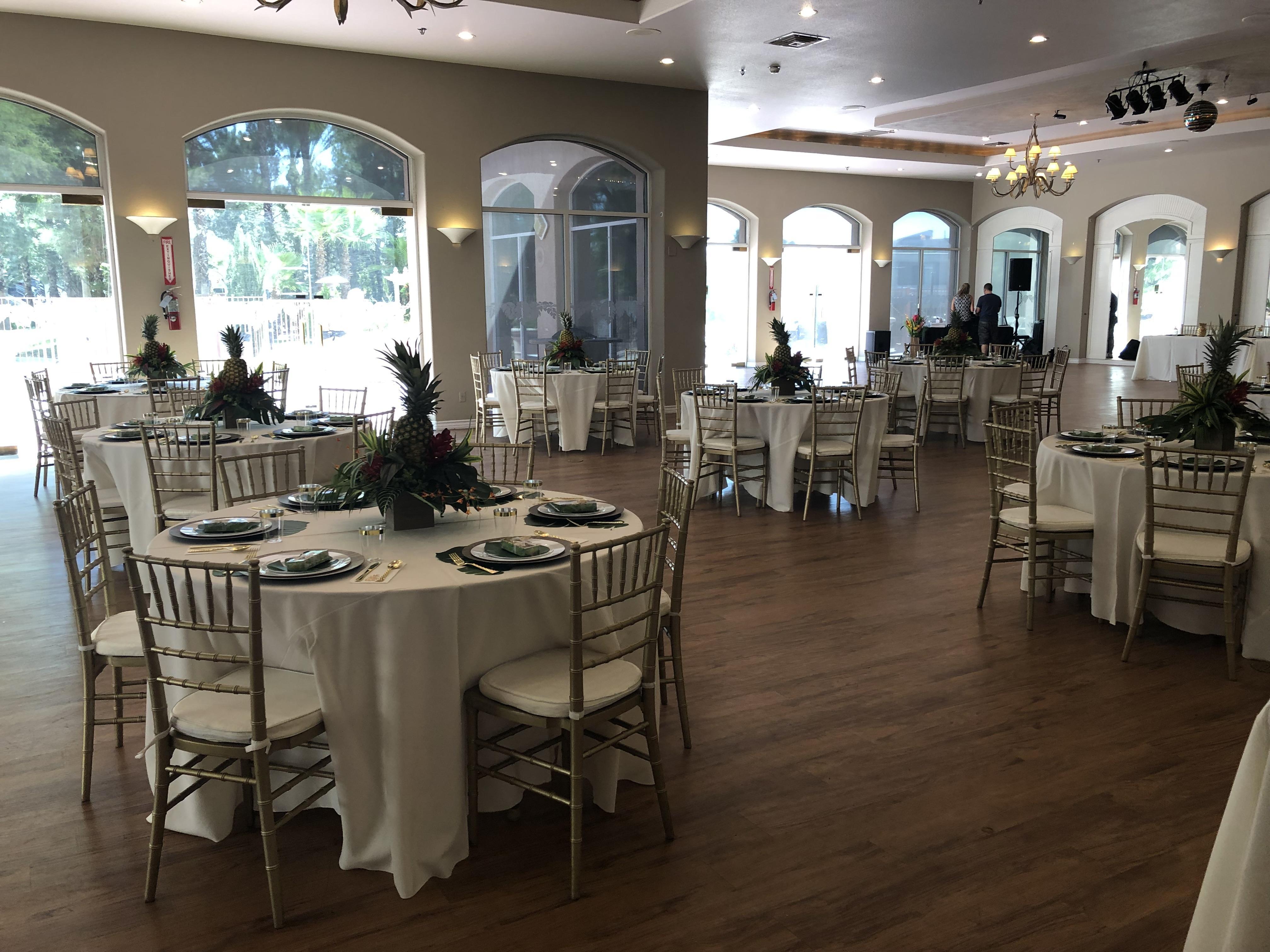 Our elegant ballroom can host up to 250 guests. Events in the ballroom have exclusive use of the patio area (over 2,000 ft. of patio space) so guests may enjoy over 6,000 sq. ft. of indoor/outdoor space in the sunny Las Vegas weather. Equipped with wood-like vinyl floors, the ballroom is perfect for any type of event.
