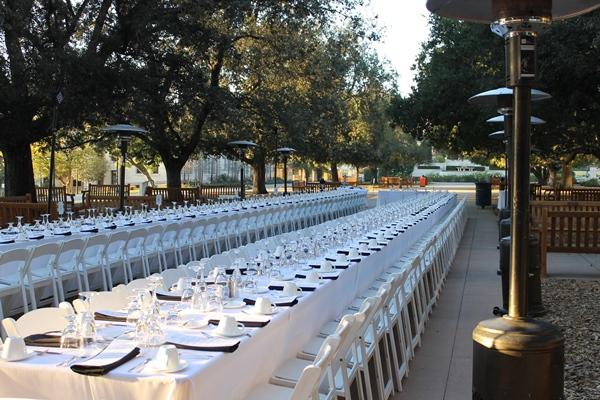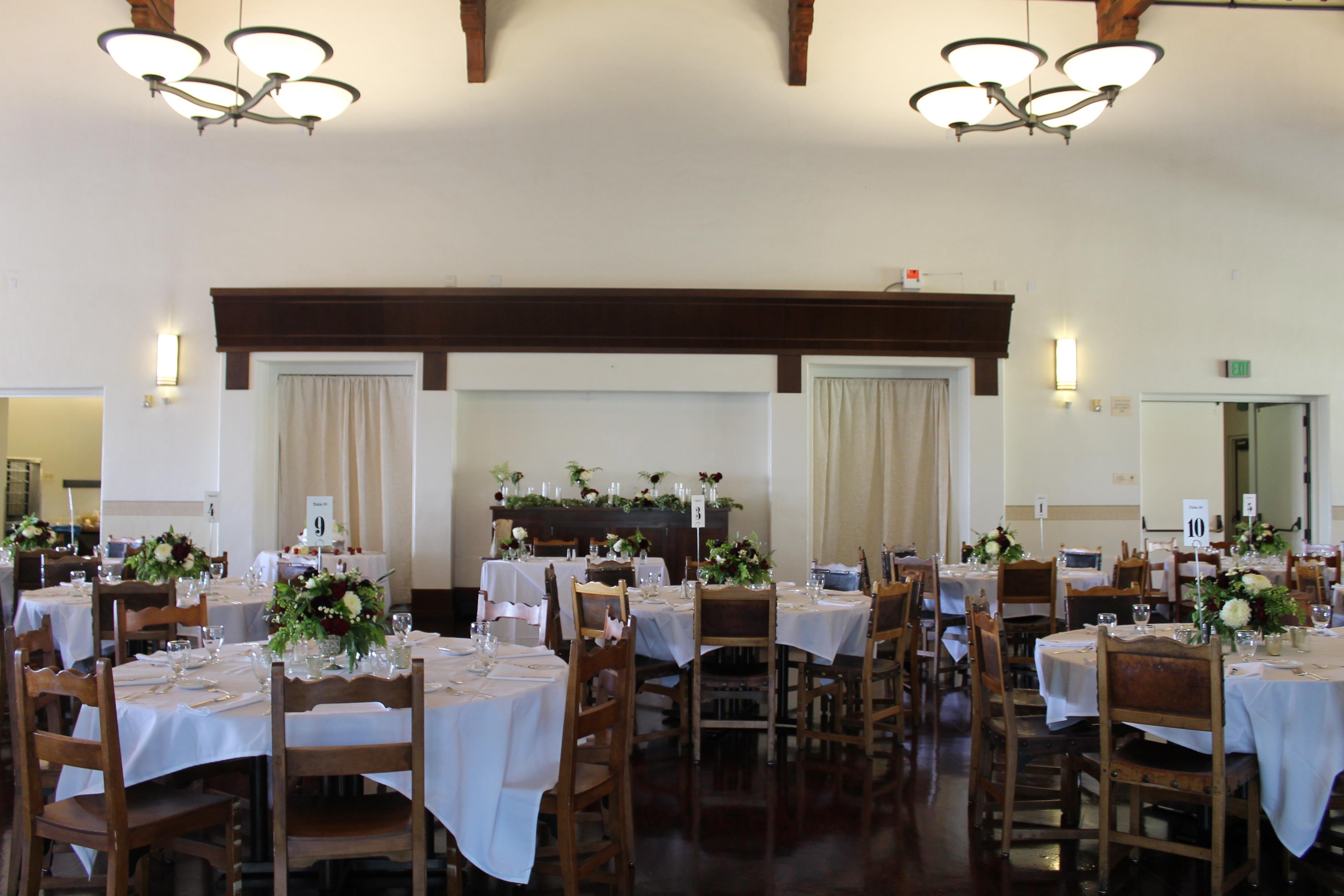 Creamy walls, high, open-beamed ceilings, tall arched windows, oak tables, and chairs create a setting that is warm and welcoming. This dining hall is available for College and private catered events on select Saturdays only, after 4 p.m. Branca Patio is recommended to be booked together with Gresham to create and indoor/outdoor space. Special price for Gresham and Branca patio booked together