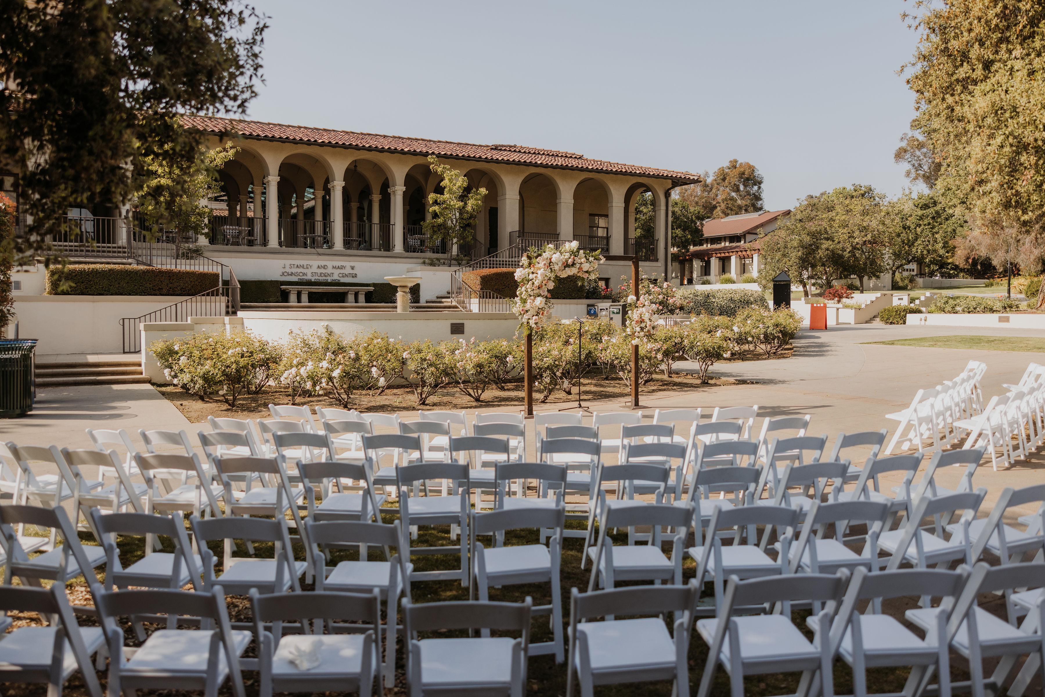 Cannon Plaza at Occidental College Once the College’s original swimming pool, Cannon Plaza is now a sunken courtyard offering an intimate, self-contained setting for weddings. Surrounded by historic architecture and greenery, it provides a timeless backdrop for ceremonies and receptions. Its versatile design transforms easily—romantic by day, glowing with lights by night—making it a truly one-of-a-kind place to say “I do.”