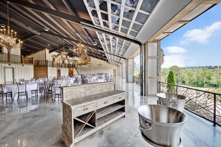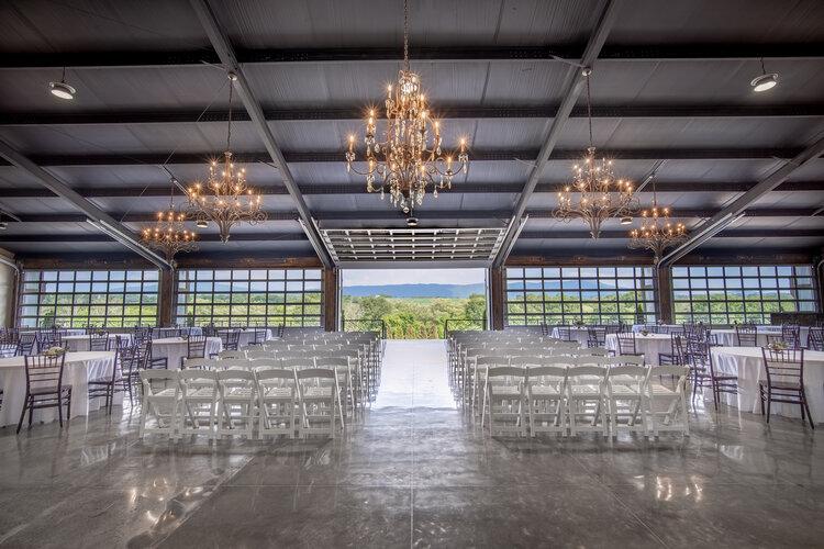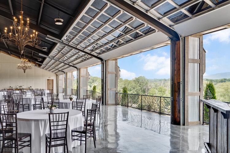 Our event venue offers an abundance of space but lacks none of the attention to detail you would find in a smaller venue. It is open, but intimate! The front includes a double-door arched entryway, while the back has five bay doors to ensure you have an amazing view of nature and the mountains, whether they are open or closed. The separate Bride and Groom Suites, as well as the Bridesmaids’ room include a private bathroom, a sitting area, as well as private space to get ready. We have carefully selected all the furnishings to make these spaces feel special for your incredible event.