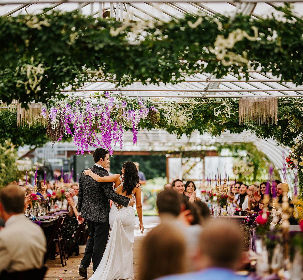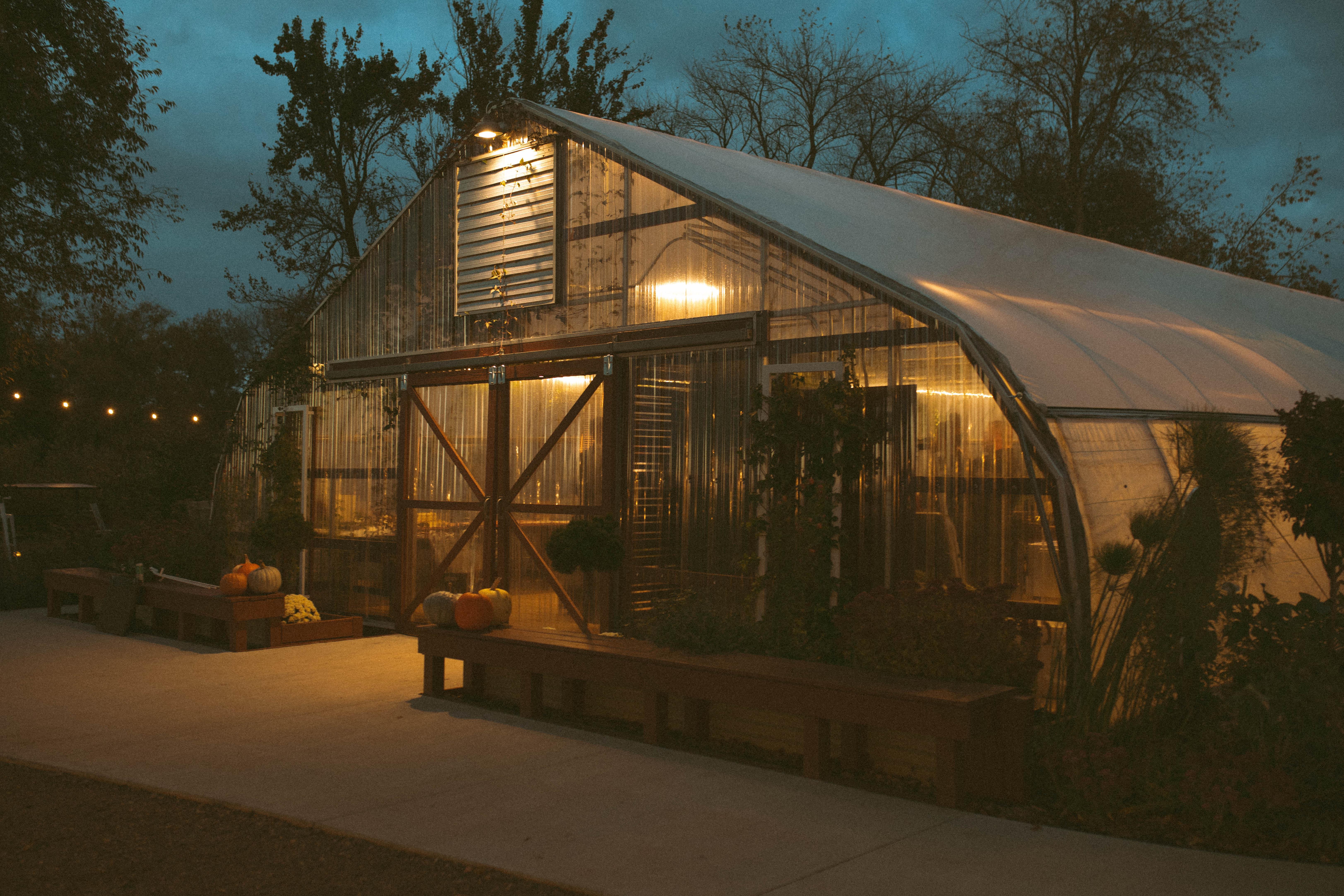 One-of-a-kind greenhouse bursting with greenery and flowers throughout the season and illuminated with Edison bulb string lights and chandeliers.