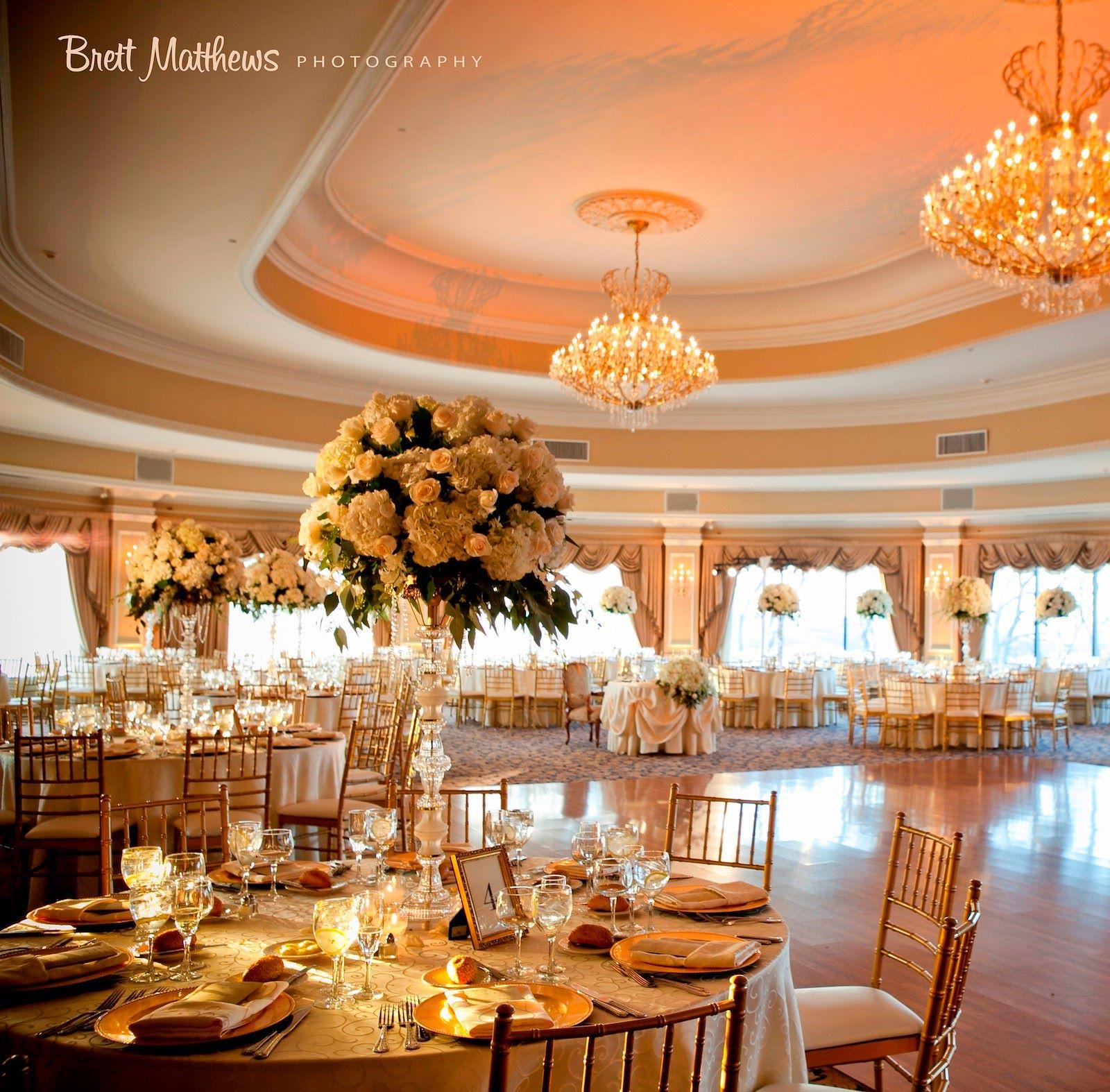 The Otto Kahn Grand Ballroom, named for the estate’s founder, features intricate plaster molding and vintage decor, reminiscent of elaborate weddings from the previous century. Up to 200 attendees can be accommodated in the ballroom for banquet-style seating.