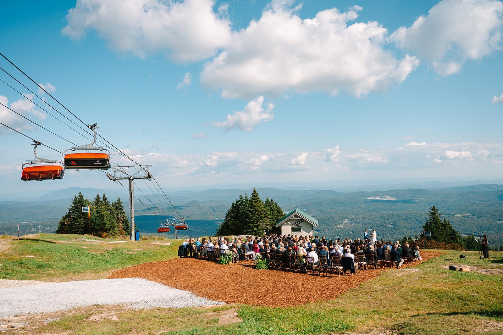 Atop the of Okemo Mountain, the Summit Lodge and Ceremony commands awe-inspiring views of the Green Mountains offering glimpses into the neighboring expanse of New Hampshire. The lodge boasts a spacious wrap-around deck, inviting guests to immerse themselves in panoramic vistas. Take in the breathtaking scenery that stretches out before you in all directions. Guests ascend to this mountaintop via the Bubble Scenic Sky Ride, an experience that adds a layer of magic to the occasion.