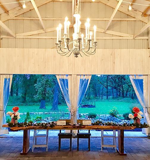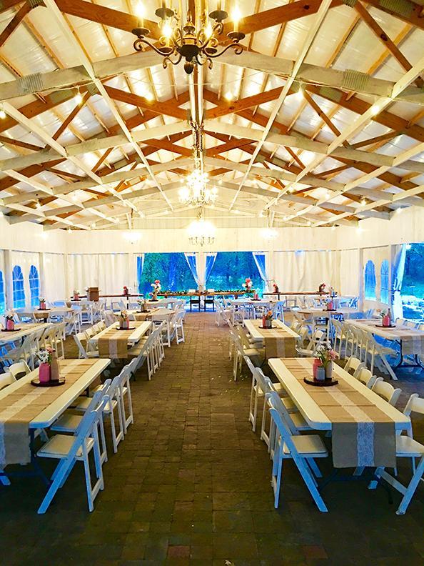 Our open-air wedding pavilion offers a stunning reception space with exposed-beam ceilings, chandeliers, dimmable lighting, and tole accents for a romantic ambiance. It features custom head tables and chairs, a dedicated wedding cake display, and ample room for dining and dancing. The open sides provide refreshing breezes and scenic views, blending rustic charm with elegance for an unforgettable celebration.