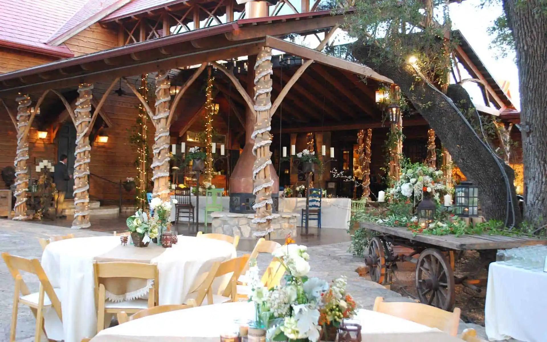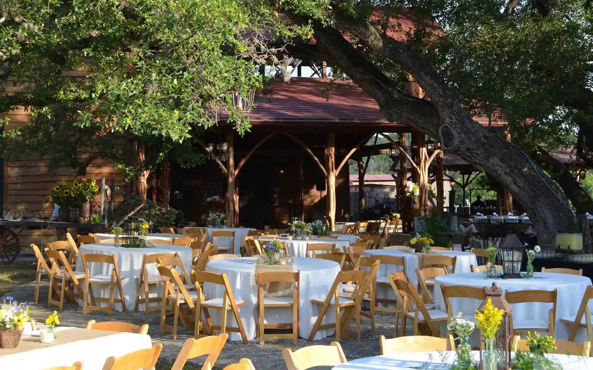 Offering panoramic hill country views in their natural state is the Covered Stone Patio, adjacent to Chapel Hall. It is the most desired area for outdoor wedding receptions and the cocktail hour, and it’s ideal both for formal or informal gatherings of all kinds. The patio is adorned with aesthetic lighting while crystal chandeliers hang from the majestic oaks. Add a beautiful sunset for your guests to enjoy while mingling and you have one of the most romantic ambiance-filled evenings imaginable.