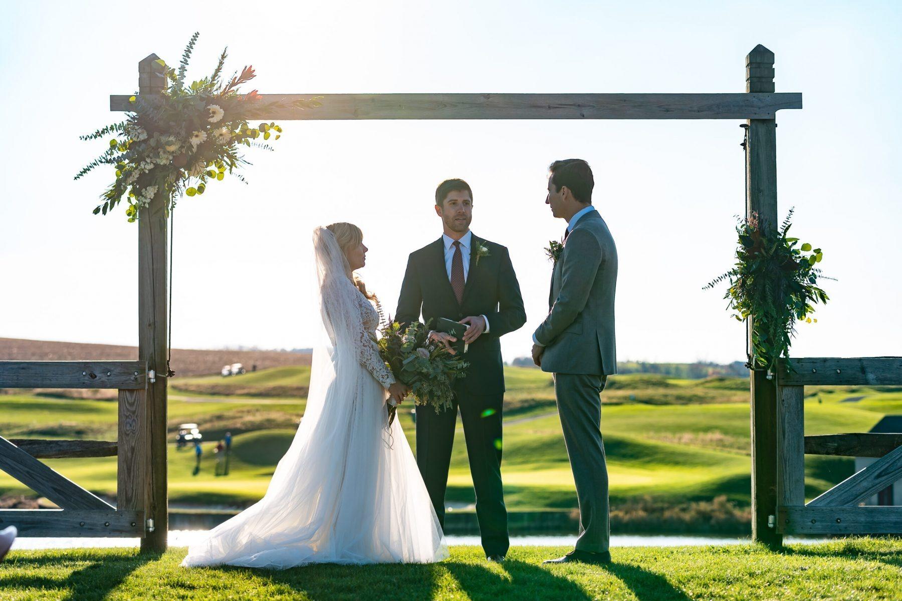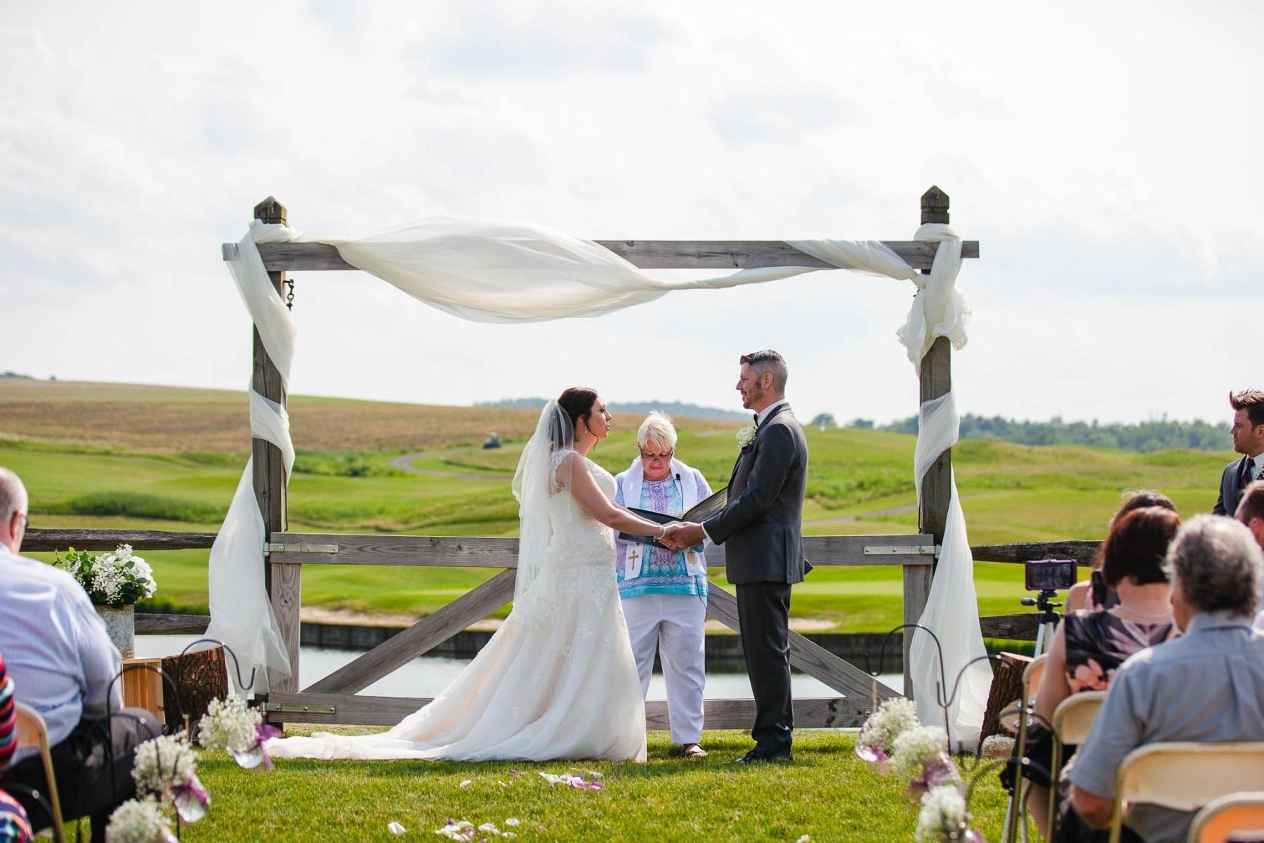 The Waterfront Ceremony site is located right behind our Bank Barn and just steps away from our charming Potato Barn. With waterfront views of the largest lake on our property, the location features a rustic gated arbor with spectacular views of not only the lake but also the golf course and actively farmed fields. The location boasts spectacular sunsets and beautiful photo opportunities for you to include in your wedding album and for you to cherish forever.