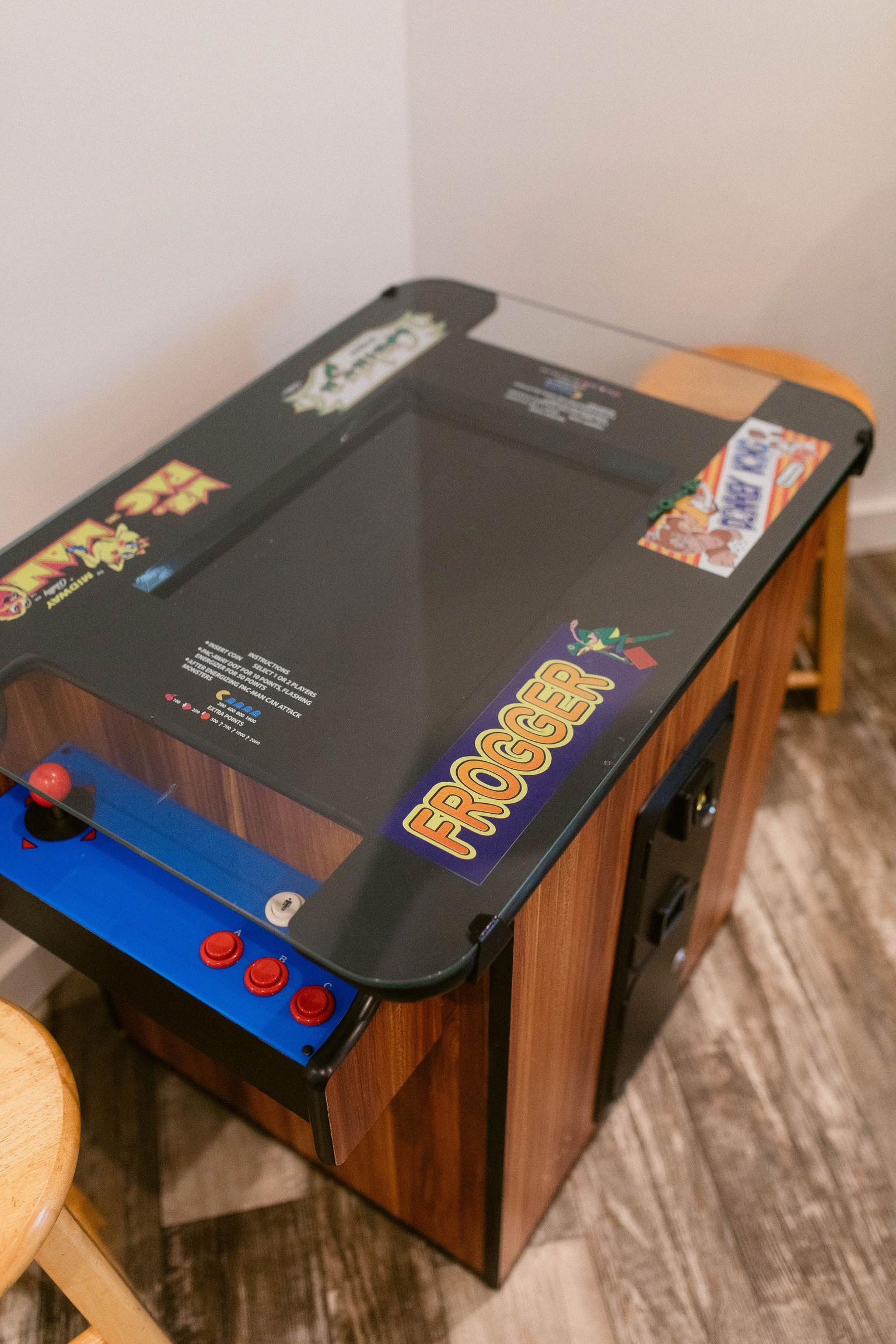 climate controlled, arcade games, tv, couch, stools, table and chairs, counter space