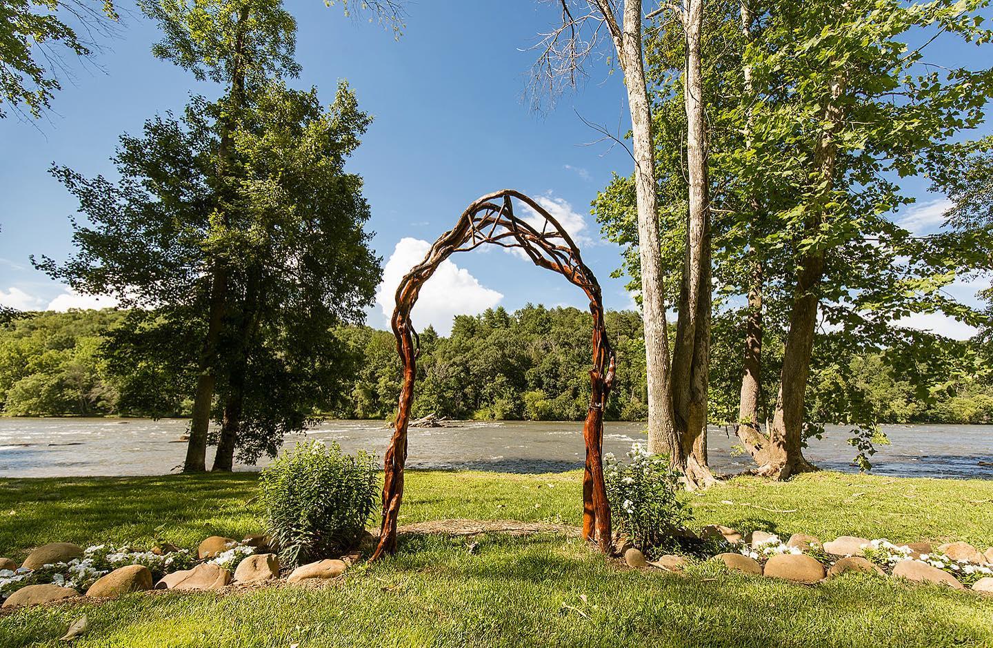 Olivette Riverside Community and Farm is located along the French Broad River at 1069 Olivette Road, Asheville, NC. Just 6.7 miles from downtown, Olivette’s 346 acres of natural beauty offers every element of an unforgettable event. You and your guests will be surrounded by the sights and sounds of nature: the rushing river, the birds, the breeze in the gently swaying trees, while at the same time enjoying the rustic comfort of our outdoor pavilion and fireplace, fire pit amphitheater, private island and beautiful wedding circle.