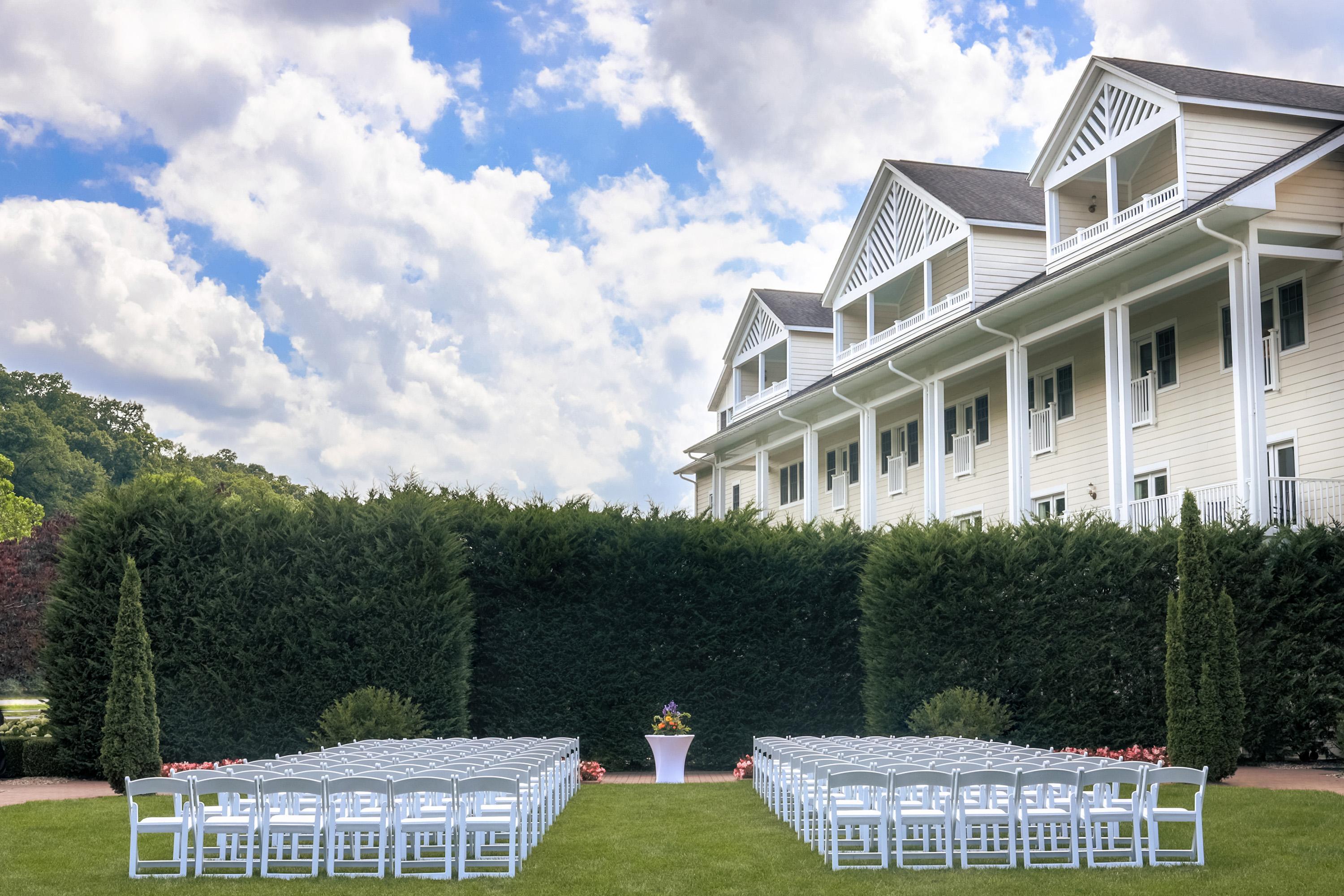 This outdoor space creates a beautiful private setting perfect for your ceremony, reception and/or cocktail hour with lush green grass.