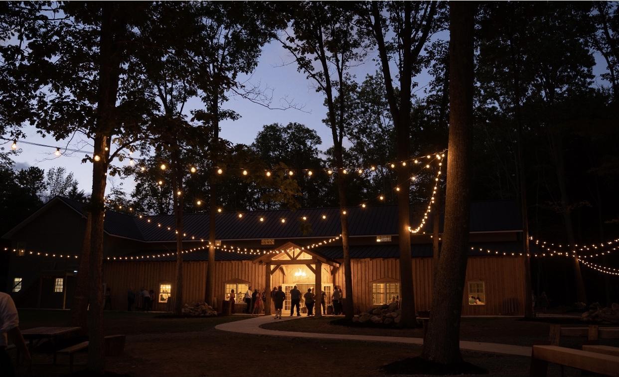 On The Hill Events is a newly built barn style venue, nestled into a beautiful string light lit, wooded, private location in Tioga County, Pa. This large venue can host up to 350 guests comfortably and can accommodate for all weather conditions. The 6,600 square ft main floor offers a well-lit, but dimmable space, heated concrete floors and a large ash wood dance floor. Above the dance floor is a loft for musicians or DJs. The beautiful live edge bar area includes everything you'll need except the booze and the bar tender. It has a two keg kegerator with built in wall mount taps and an icemaker. The spacious, full service kitchen has everything but the caterer and the lease includes all tables and chairs. Upstairs is a 3 bedroom, 1 bathroom loft with central air. The bridal suite has 1 king size bed. There is 1 queen size room and a 2 double bed room with plenty of room for an air mattress or cots. The 24x60 pavilion has a kitchen, his and hers bathroom + shower. No closing hour!