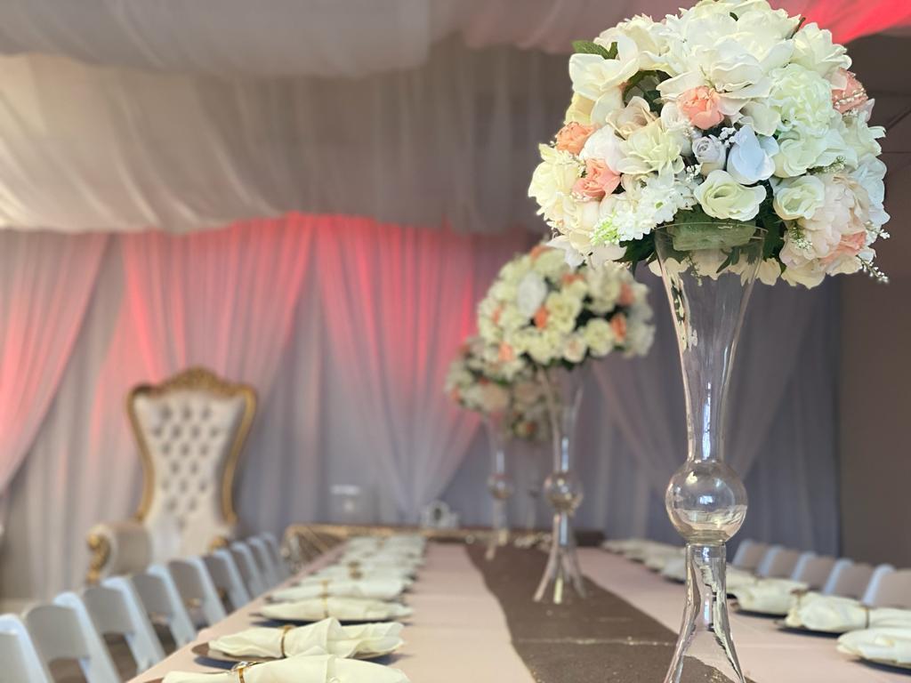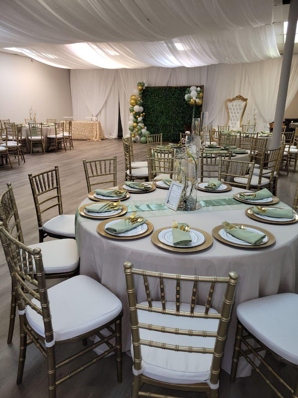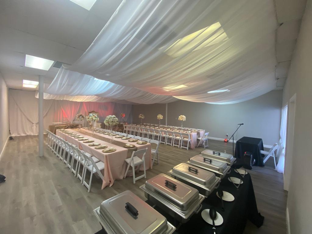 VENUE -✅8 Hour (2pm - 10pm)✅ 4,800 sq ft✅ Kitchen Space✅ Tables and Chairs✅ Complete Venue Draping ✅ Starburst Ceiling Draping✅ Venue Uplighting✅ Free Parking✅ UP To 100 Guests 🌸 RECEPTION DECOR -✅ Reception Décor Setup & Breakdown✅ Venue Cleanup🌸 Head table Décor🌸 Guest Table Decor✅ Linen✅ Centerpieces✅ Charger Plate✅ Fabric Napkin🌸 Other Special Tables Linen-STAFF -🌸 Event Sales Consultant 🌸 Décor Specialist 🌸 Day of Supervisor