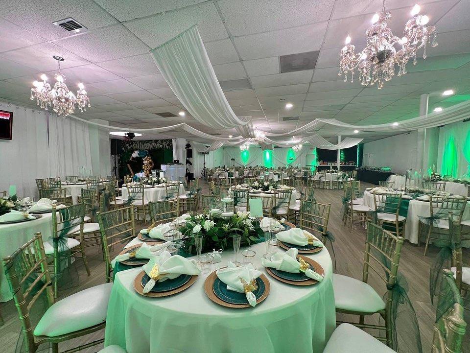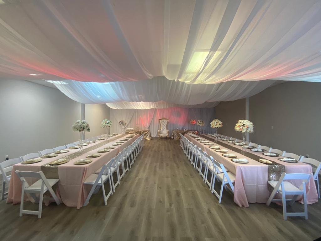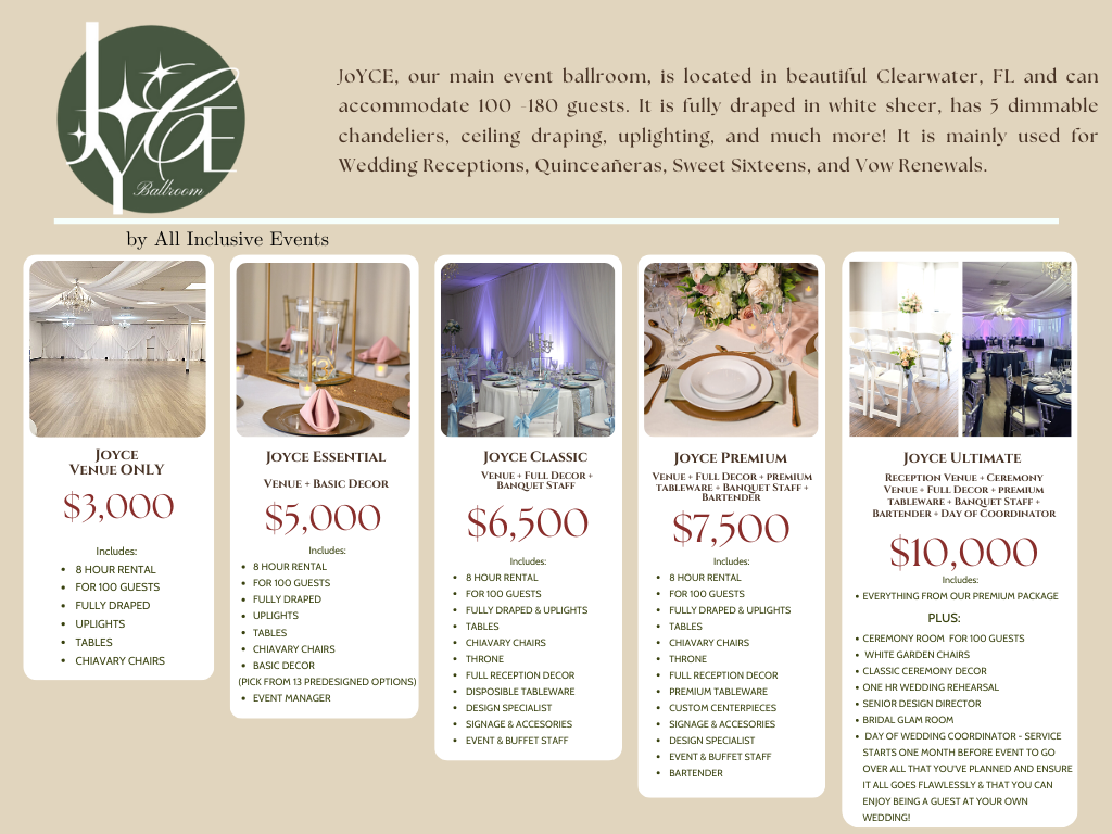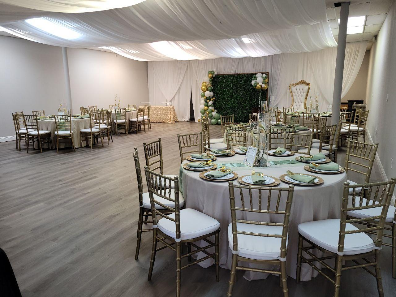 "The JoYCE" is our main event ballroom and where it all began! It is located in beautiful Clearwater, FL and can accommodate 100 -180 guests and it is fully draped in white sheer, has 5 dimmable chandeliers, ceiling draping, uplighting, and much more! It is mainly used for Wedding Receptions, Quinceañeras, Sweet Sixteens, and Vow Renewals. Schedule a venue tour today to see it for yourself!