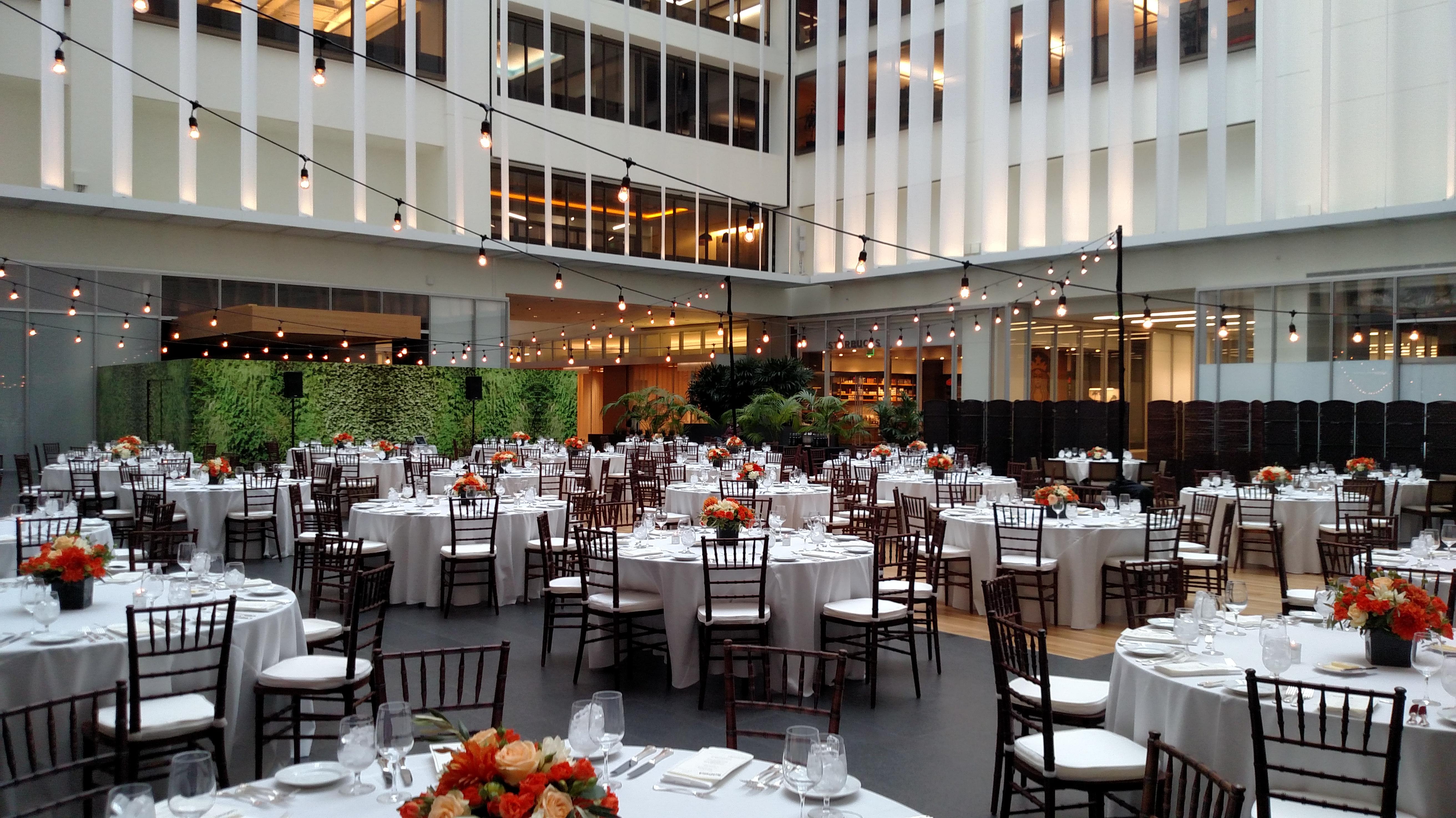 Features: engaging space with a 200ft atrium glass ceiling. Capacity: seated up to 500 (depending on set up), reception: up to 1000+ (depending on set up), seated with reception: up to 300 (depending on set up). Booking Details: 50% deposit of Food & Beverage minimum required, Full payment of Food & Beverage minimum and estimated costs 4 days before event. Additions: flowers, A/V, valet parking, optional reception space, gift bags, large built-in wood dance floor.
