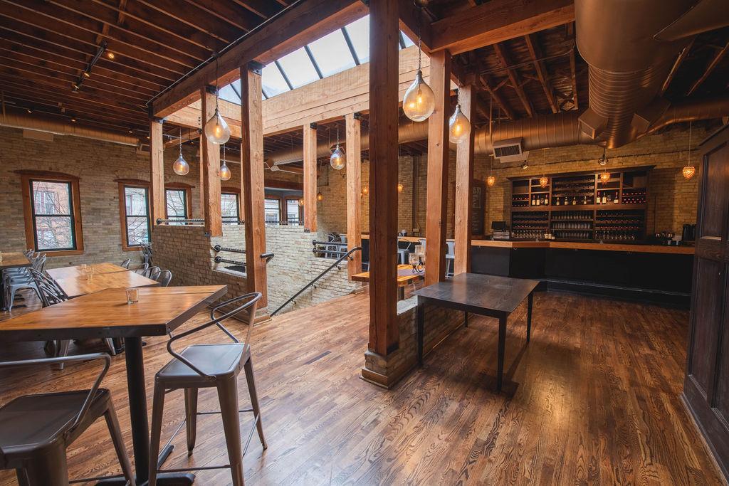The event space is on the second floor and is completely private. Onesto has a truly Milwaukee feel with wood flooring, timber ceiling, cream city brick walls, local artwork, windows overlooking the Historic Third Ward, a dramatic skylight and three fireplaces.