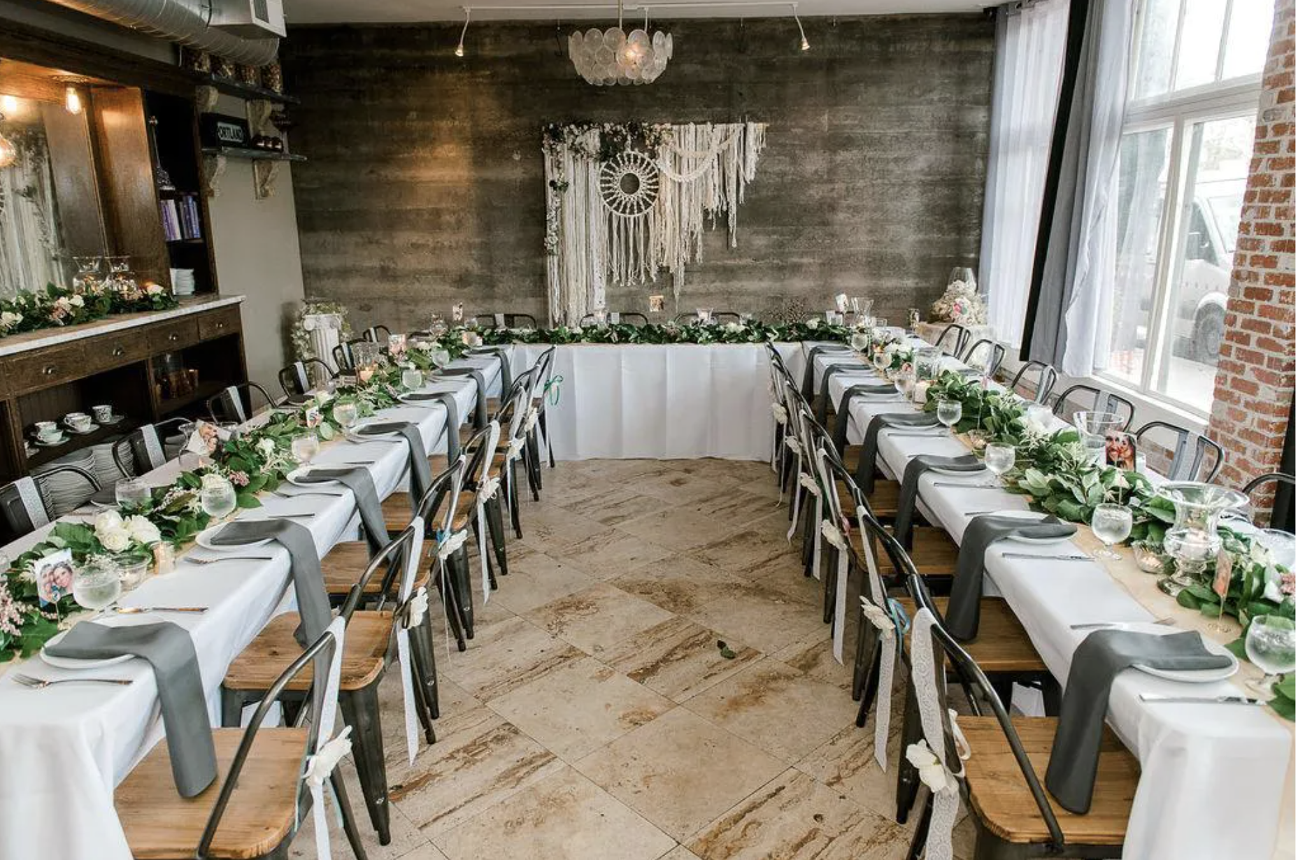 (4) 60” round tables seats 8ppl, (4) 8’ rectangle tables seats 10 ppl, (2) 6’ rectangle tables, (6) high top bistro tables, (3) 3’ square tables, (40) black banquet chairs, place settings, servingware, glassware, black or white assorted linen napkins, runners & centerpiece options, 1 OLCC bartender, surround sound for headphone jack connected music, 54” HD Smart TV and adapters to show a photo slideshow.