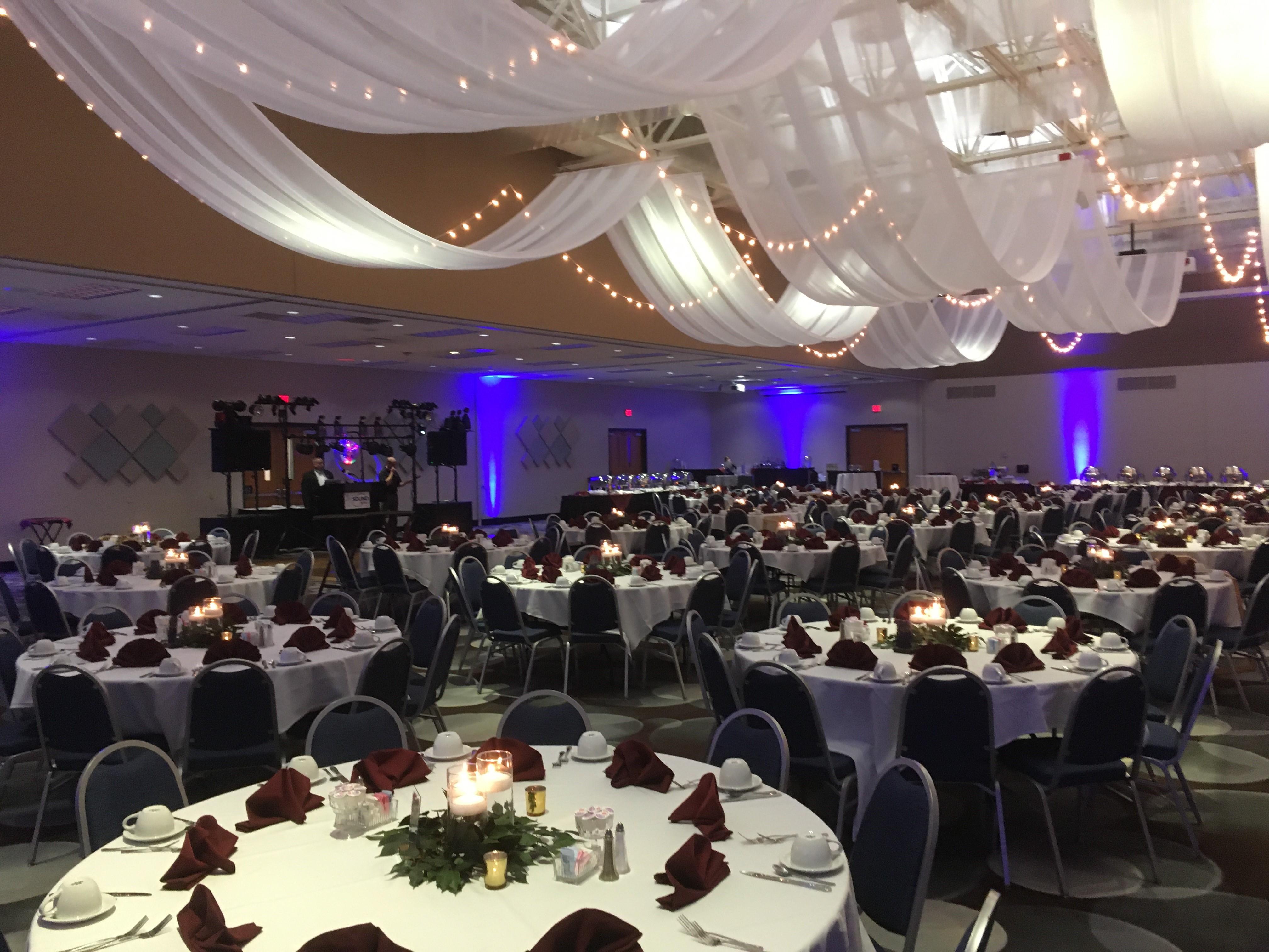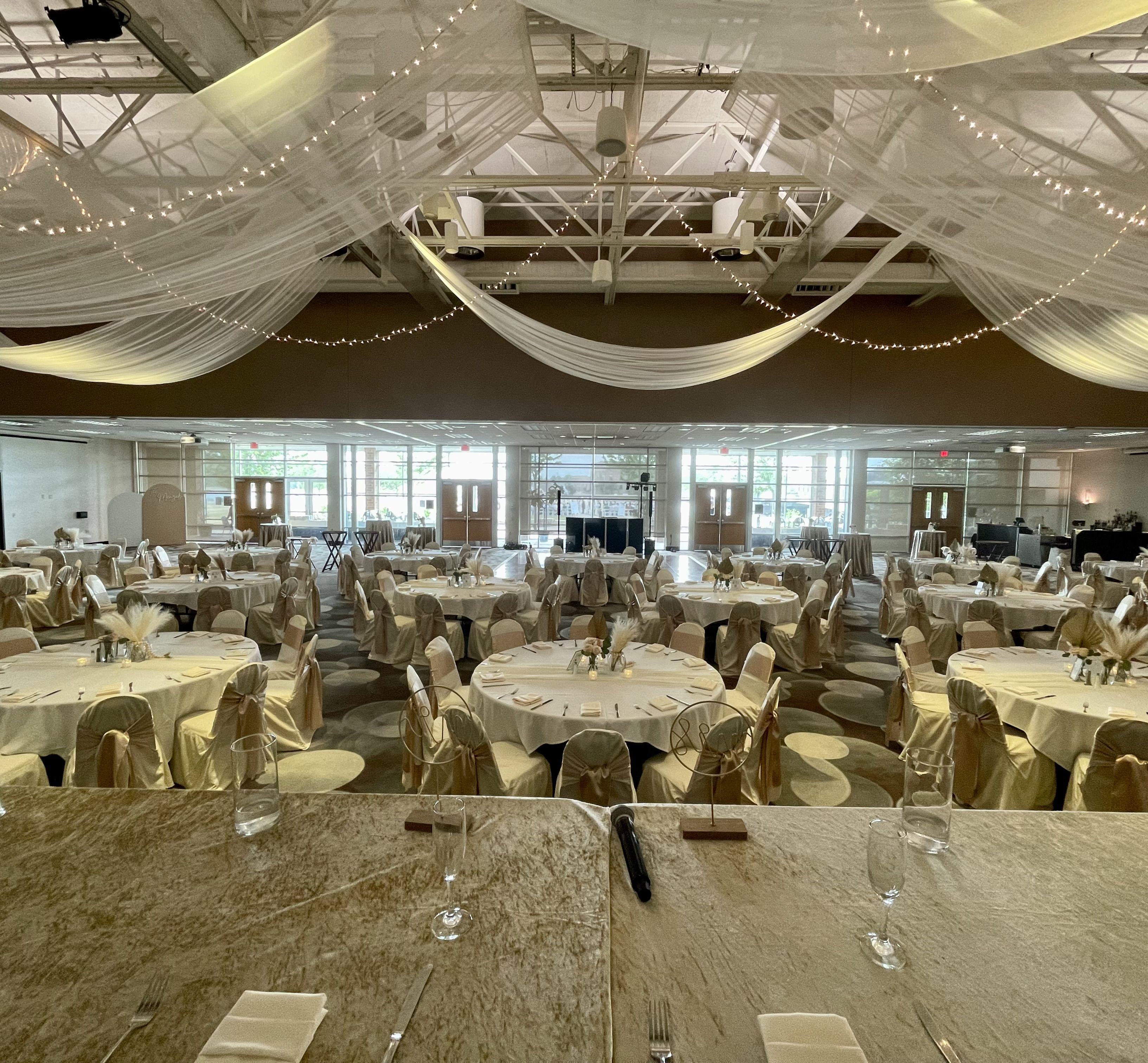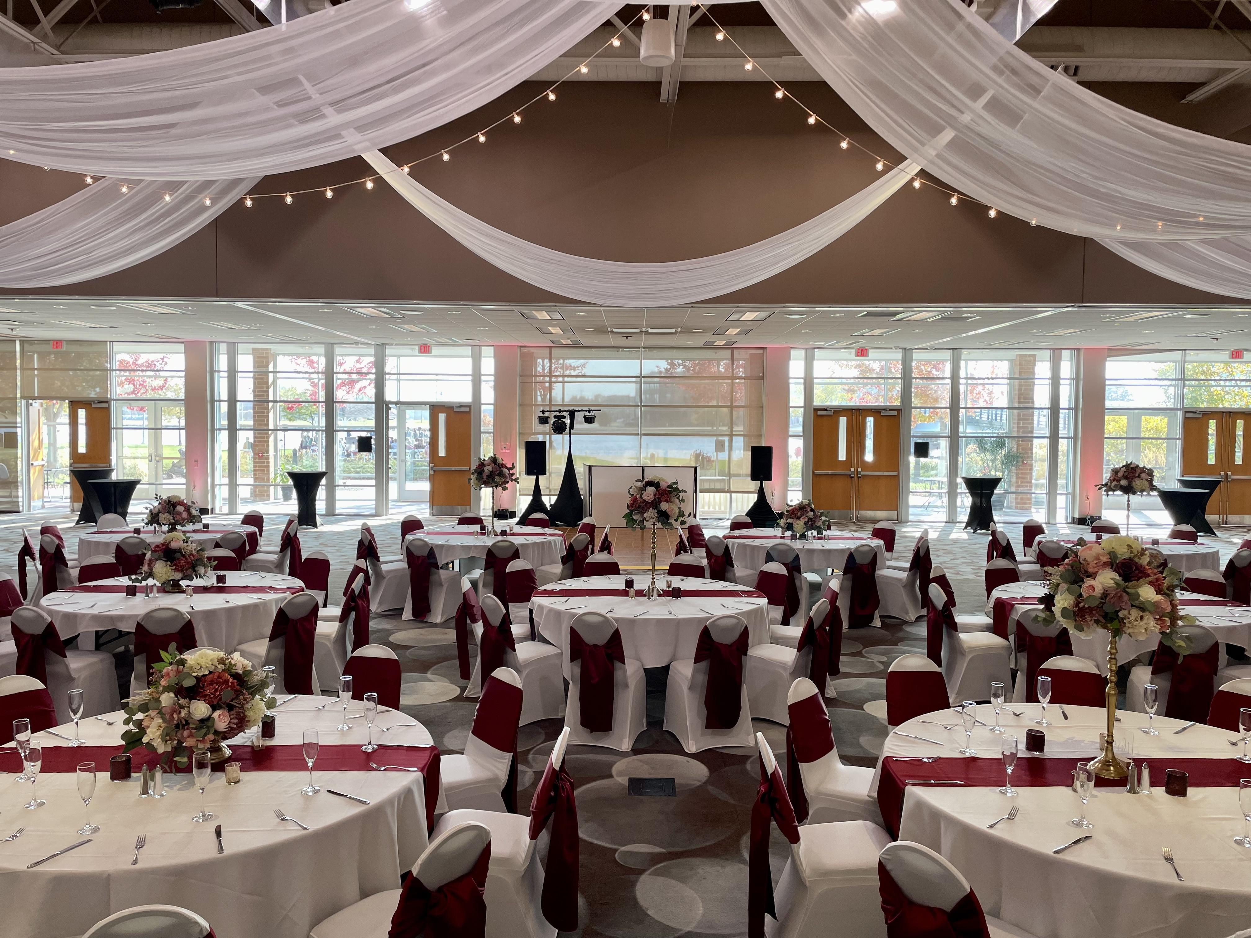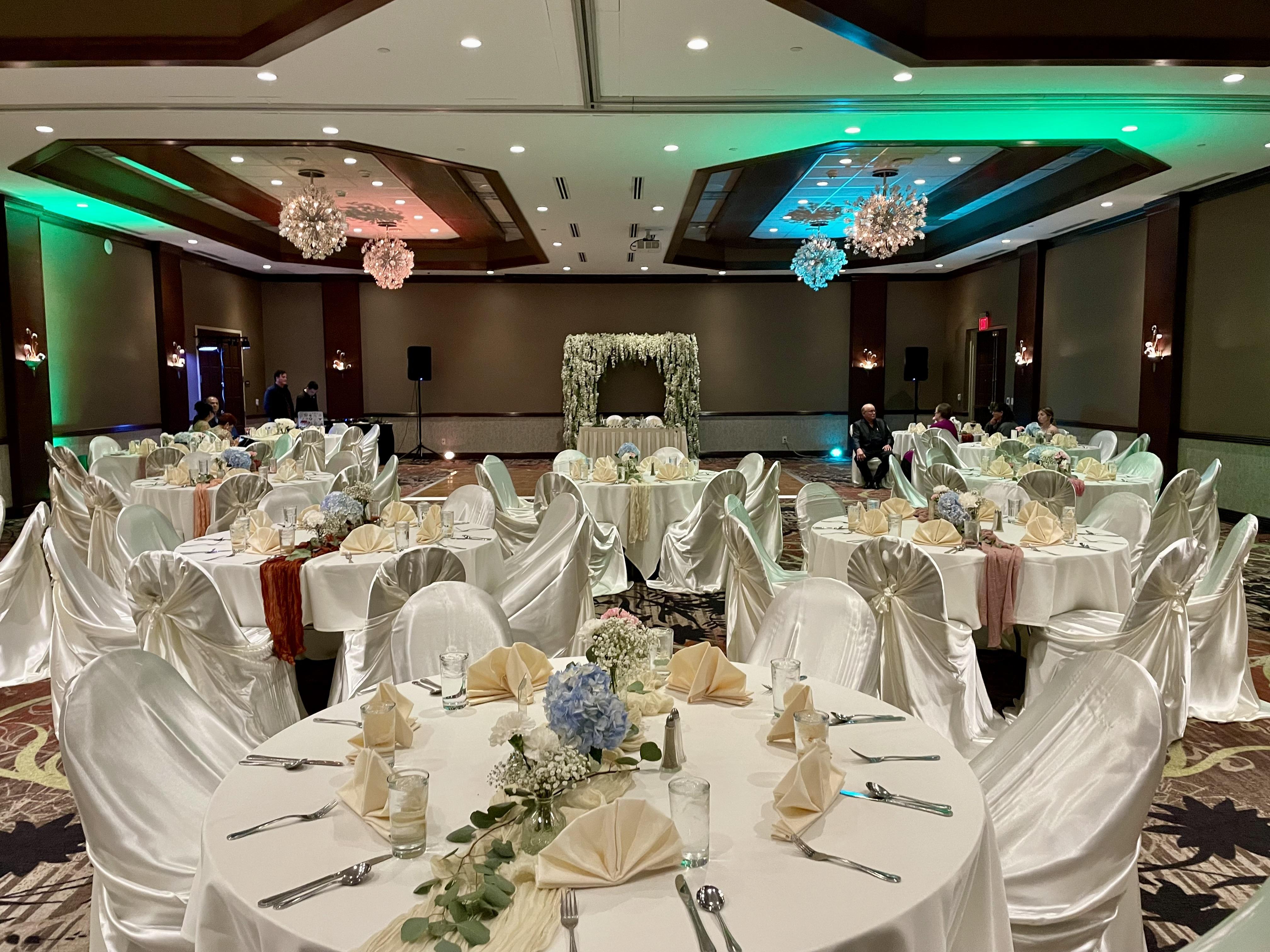 All rentals include guest tables and chairs, white or ivory tablecloths, a variety of linen napkins, auxiliary tables, risers for head table or DJ/Bands and a dance floor. Our in-house catering services provide all the necessary dinnerware & staff to service your reception.