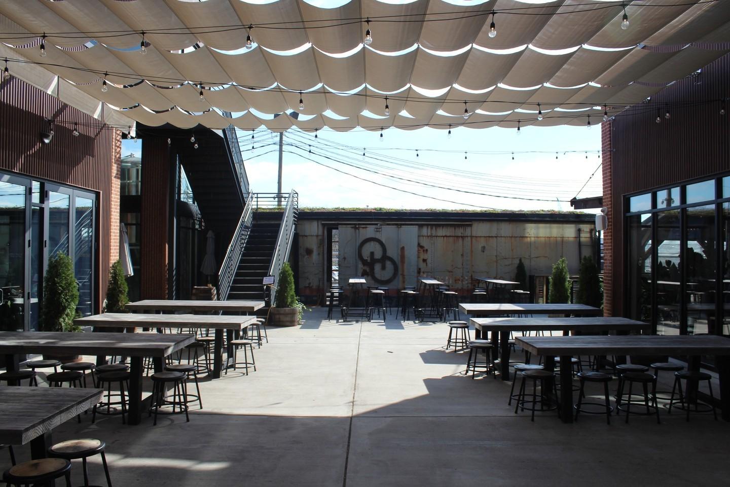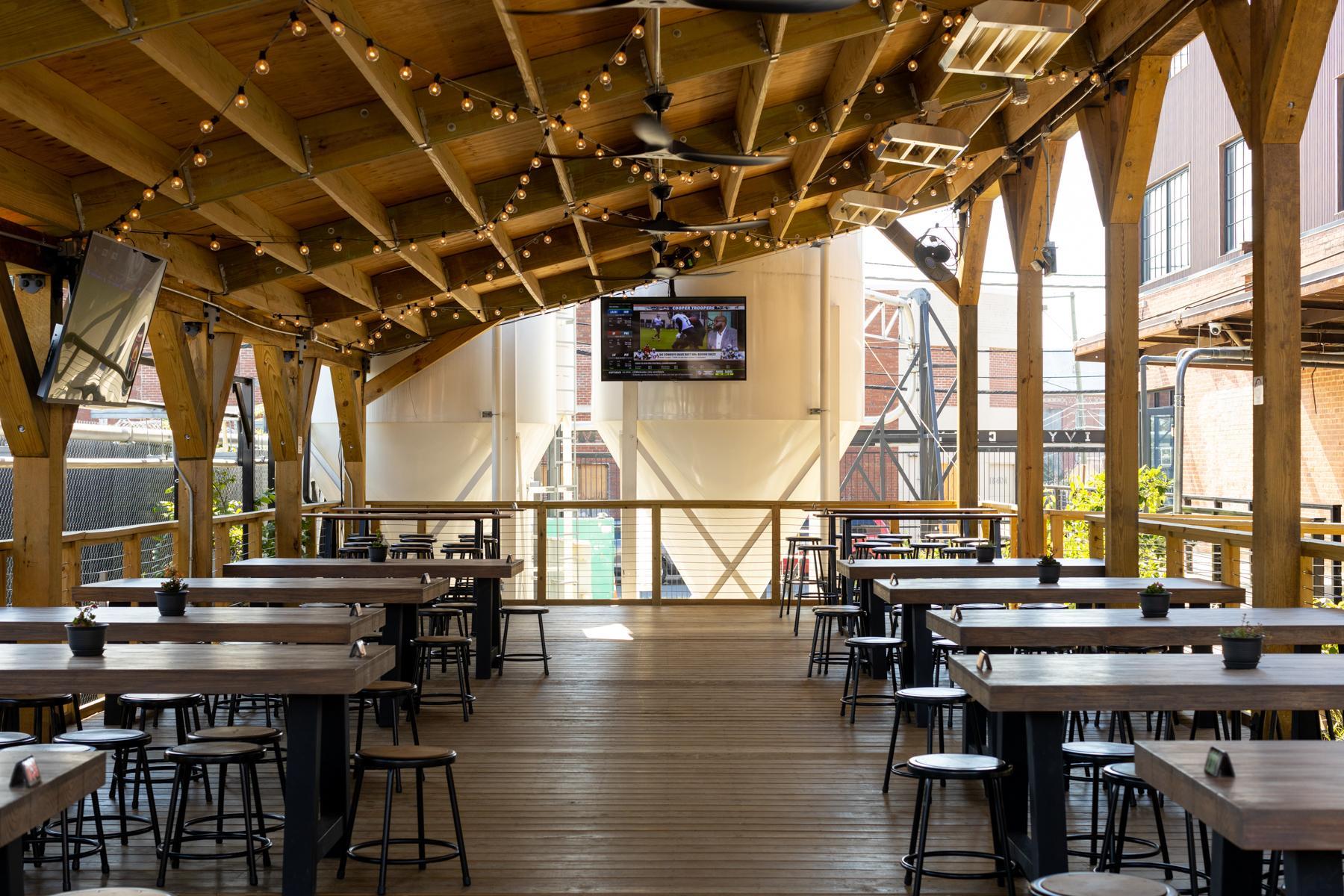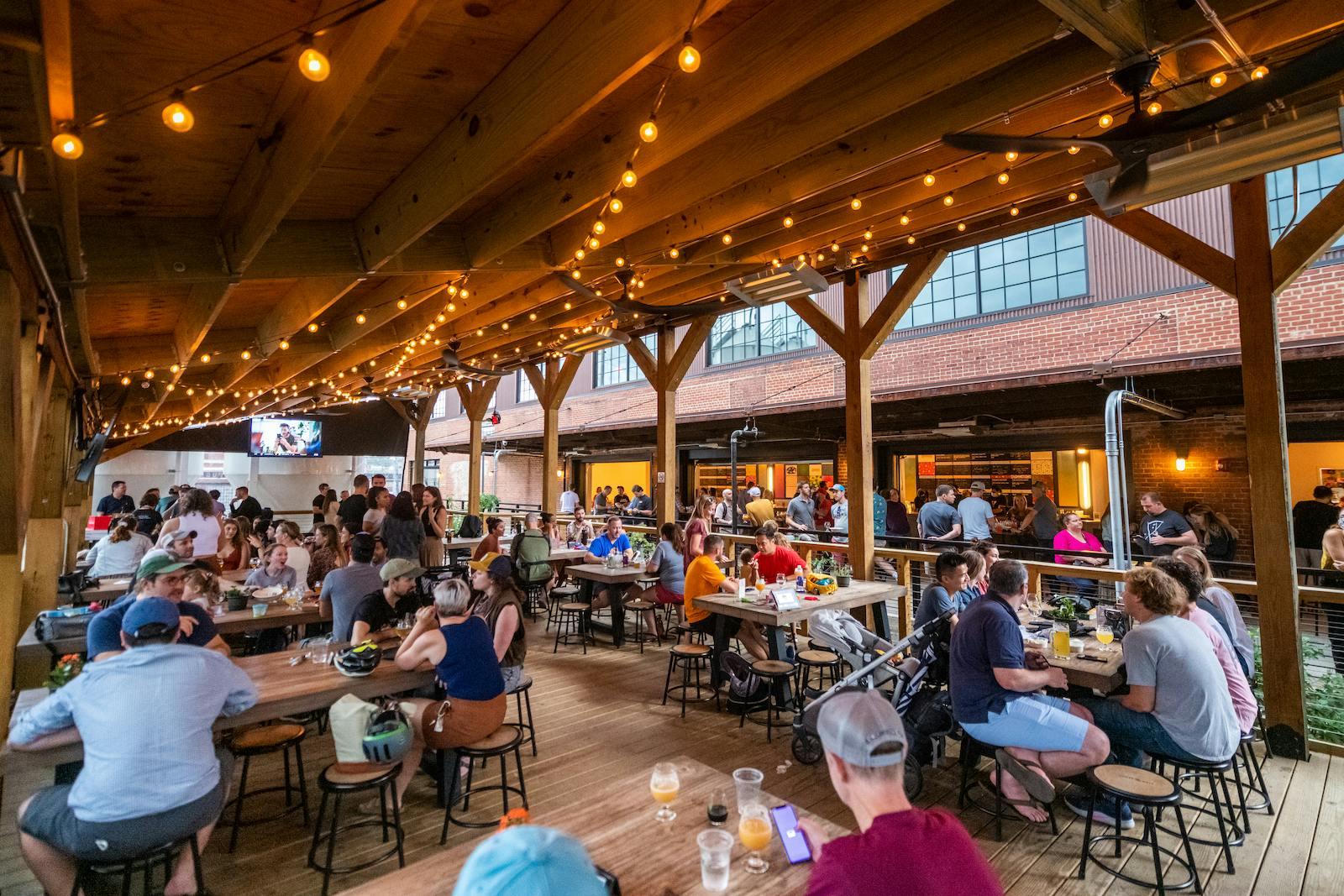 Tucked between our grain silos and historic boxcar, the Pavilion offers a unique covered outdoor setting perfect for wedding welcome parties, rehearsal dinners, or post-ceremony receptions. Located steps from the main taproom, this semi-private space features overhead heaters and ample shade for all types of weather, and TVs for custom slideshows or entertainment. Guests can enjoy our full selection of draft beers, cocktails, and non-alcoholic options in a laid-back, industrial-chic atmosphere.