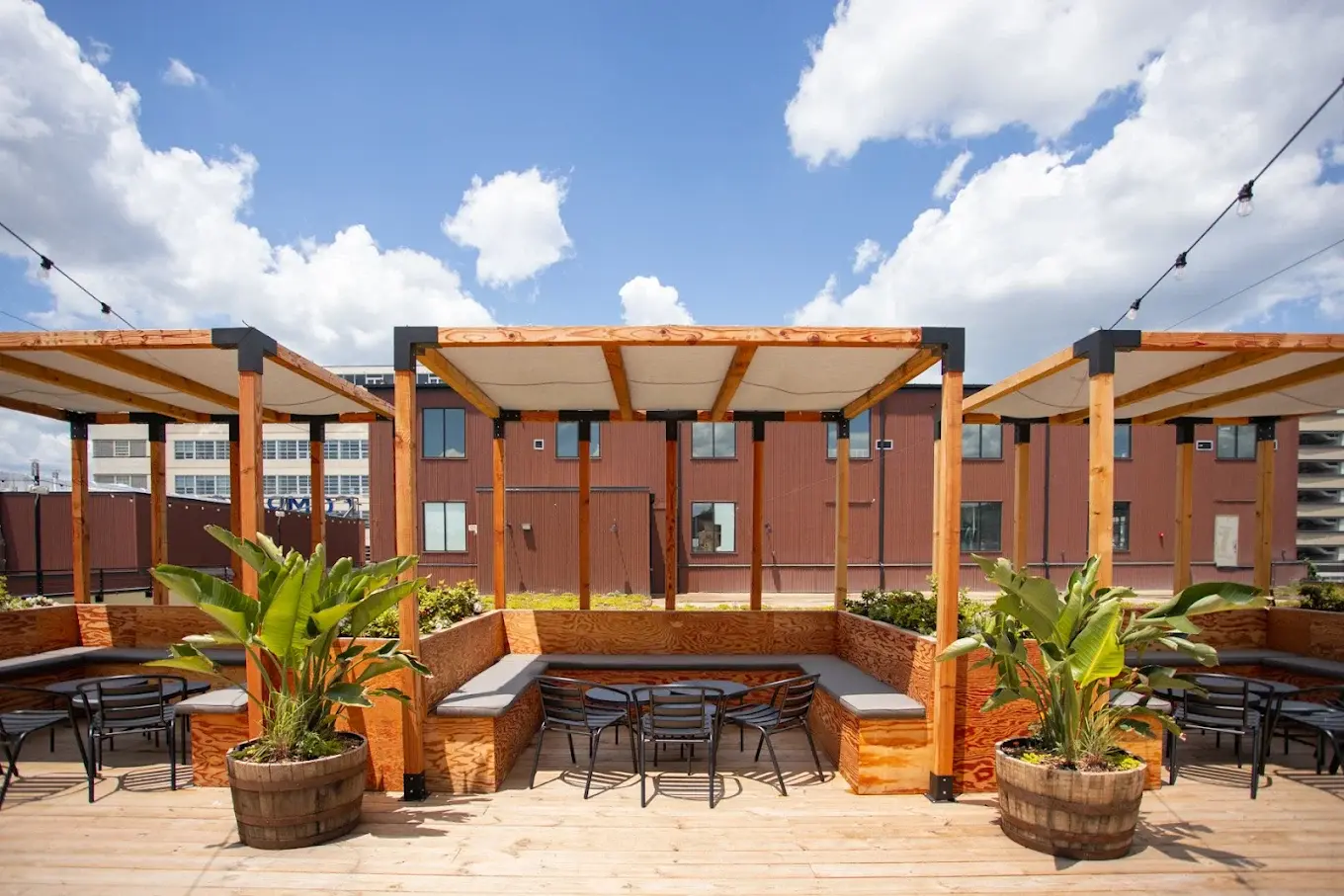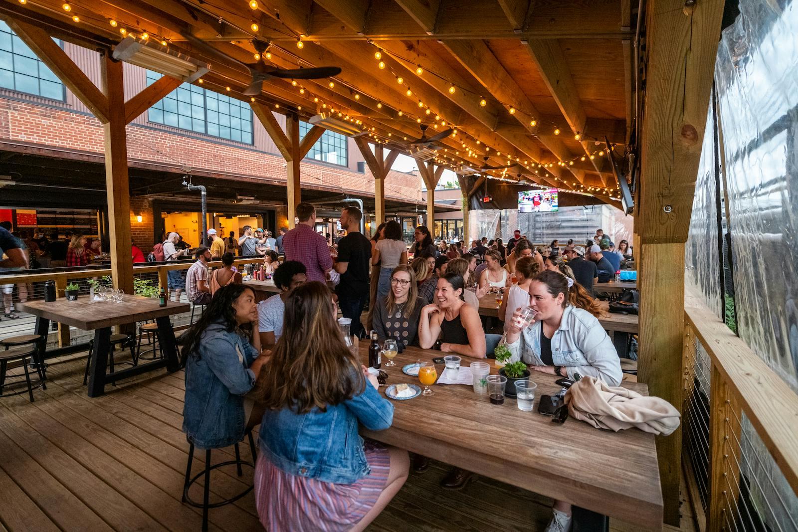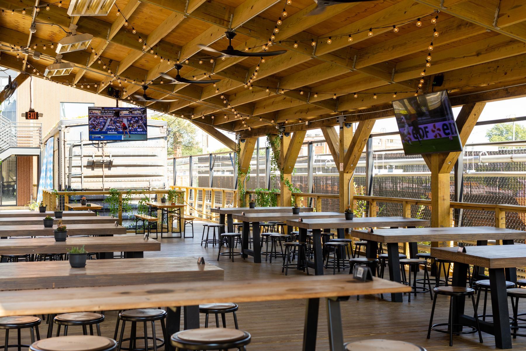 Tucked between our grain silos and historic boxcar, the Pavilion offers a unique covered outdoor setting perfect for wedding welcome parties, rehearsal dinners, or post-ceremony receptions. Located steps from the main taproom, this semi-private space features overhead heaters and ample shade for all types of weather, and TVs for custom slideshows or entertainment. Guests can enjoy our full selection of draft beers, cocktails, and non-alcoholic options in a laid-back, industrial-chic atmosphere.