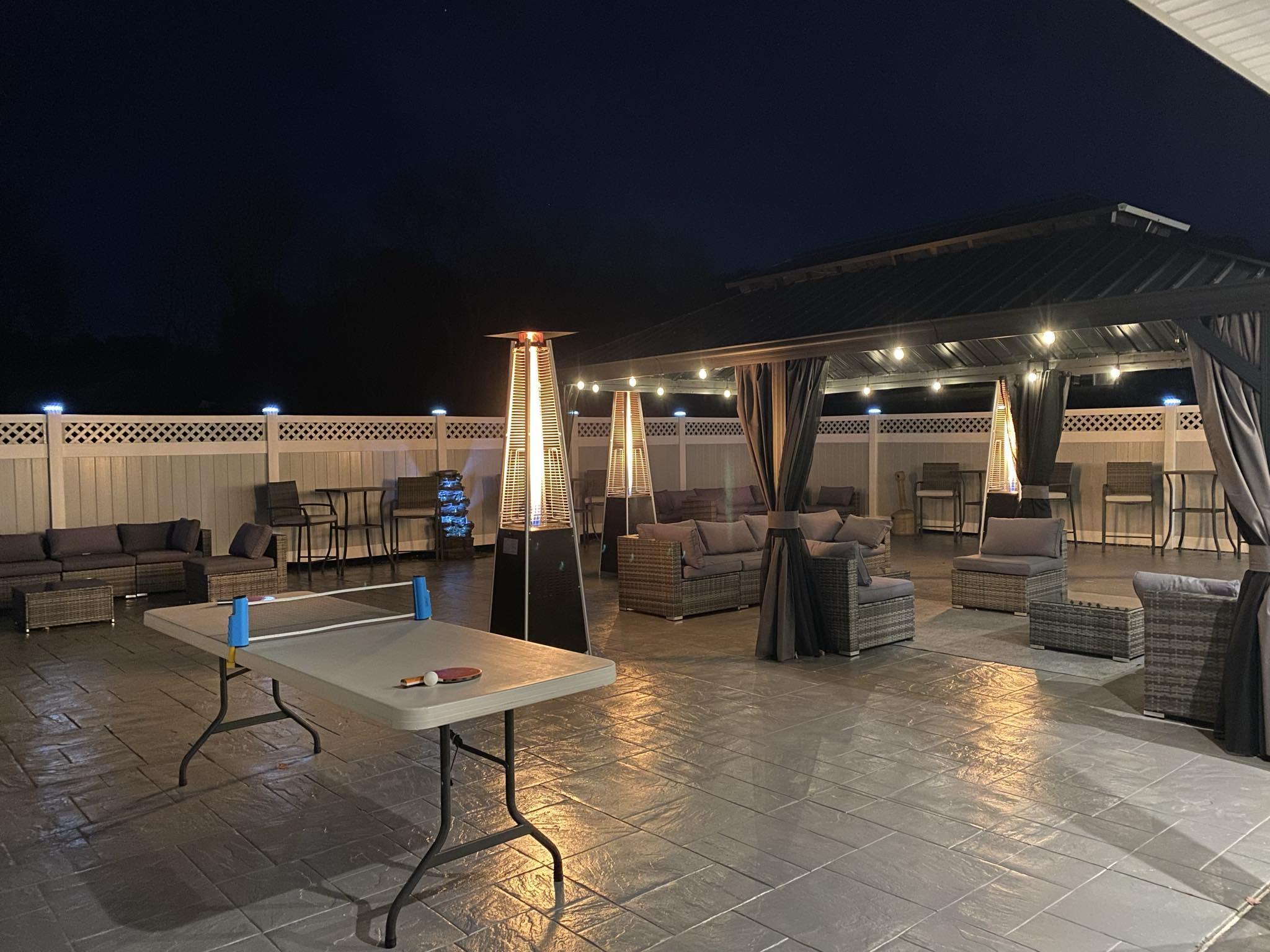 * 65" color tv * blue tooth speakers * karaoke machine * patio heaters * waterfall