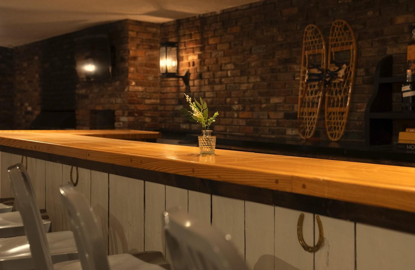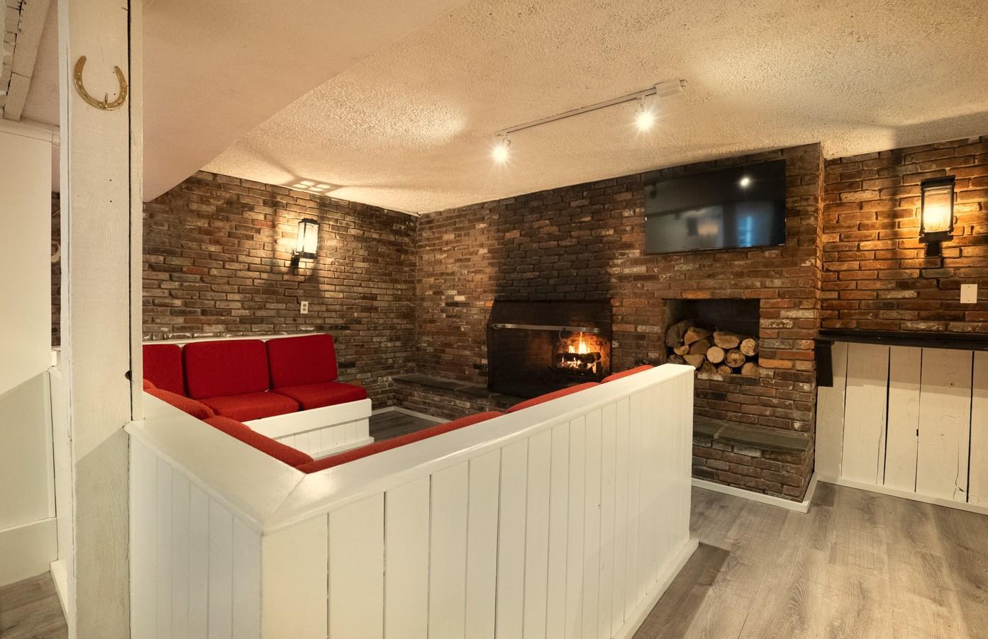 Tucked beneath the main level of Outbound Stowe lies The Maples Room—a warm, rustic speakeasy-style venue that blends timeless charm with modern comforts. Exposed brick walls, horseshoe accents, and vintage snowshoes give the space a nostalgic Vermont lodge feel, while cozy red booth seating and a wood-burning fireplace create a welcoming ambiance for intimate gatherings.