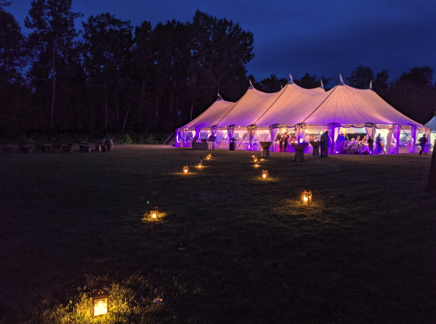 - Tables - options for Farm Wood Tables and Benches, or Rounds and Chairs, includes Bar Setup, Dance Floor, Private Patio and Fire Pit
