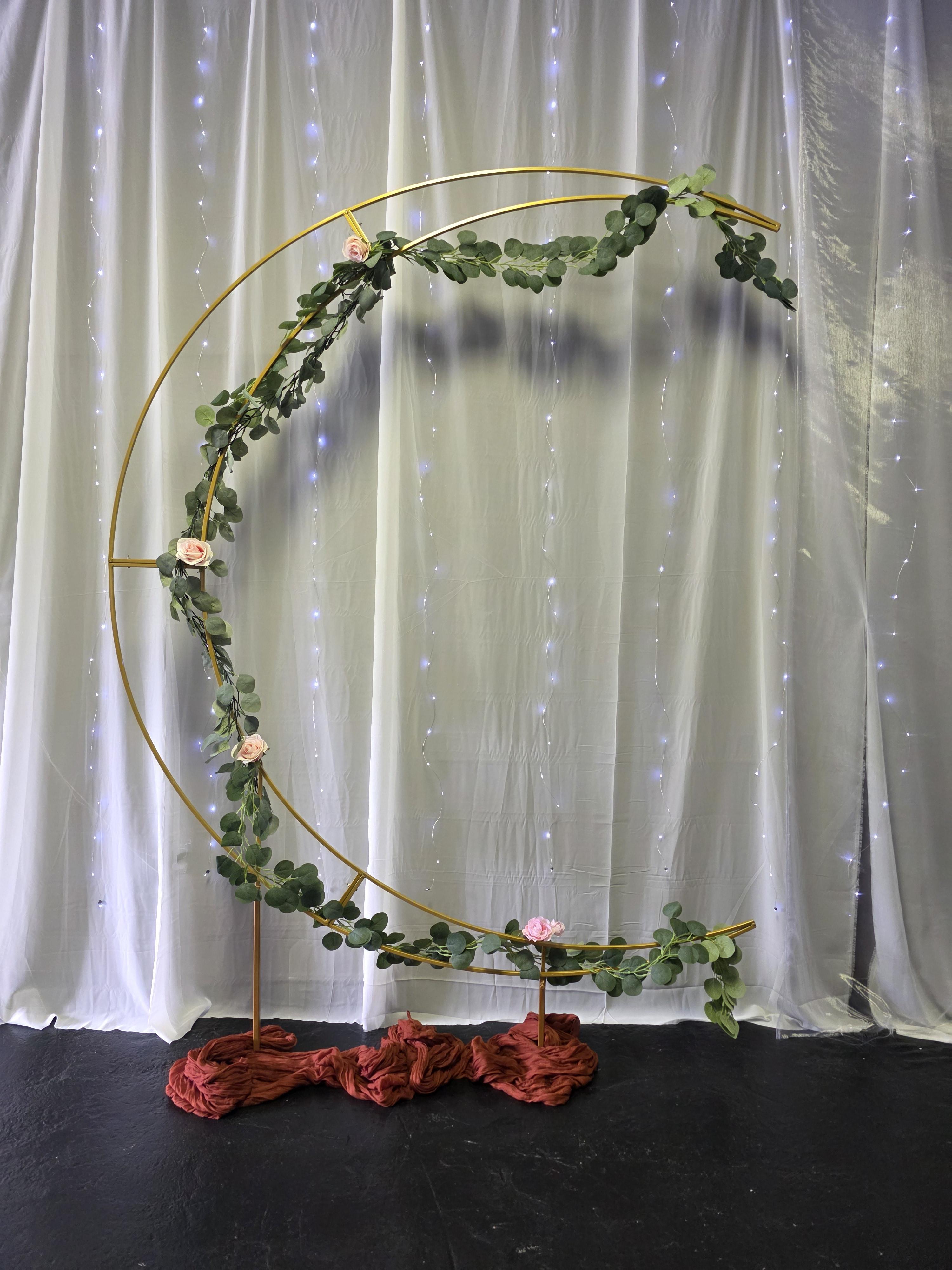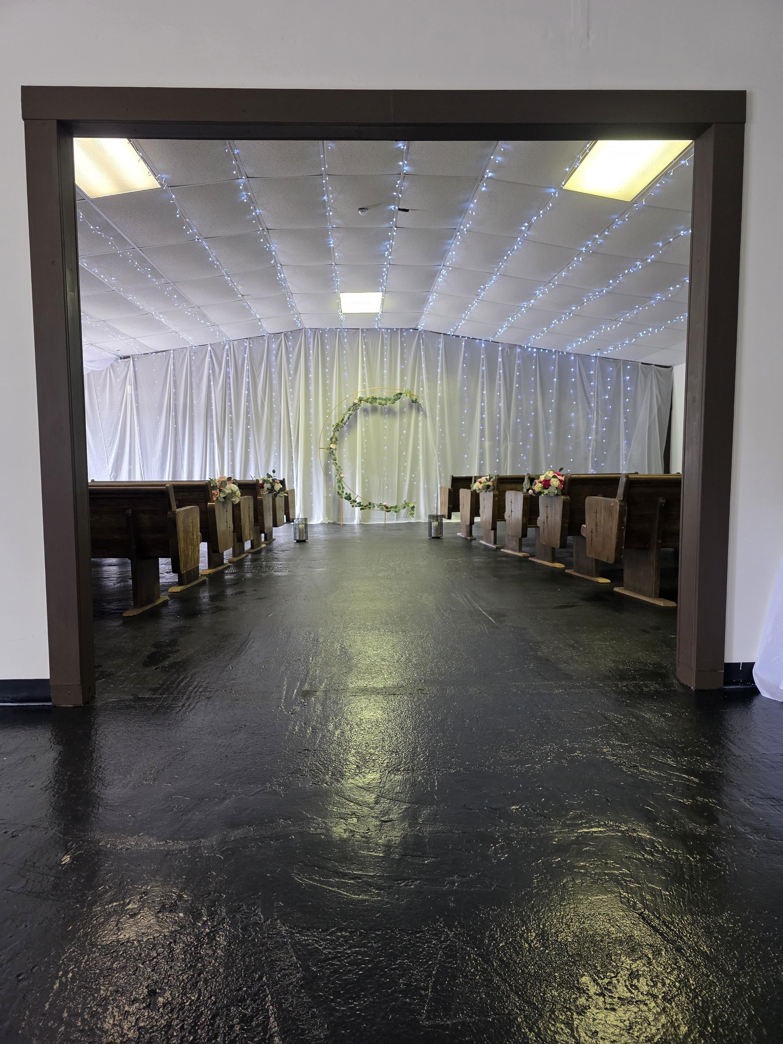 This space features 14 church pews, twinkling lights and the use of a moon shaped arbor.