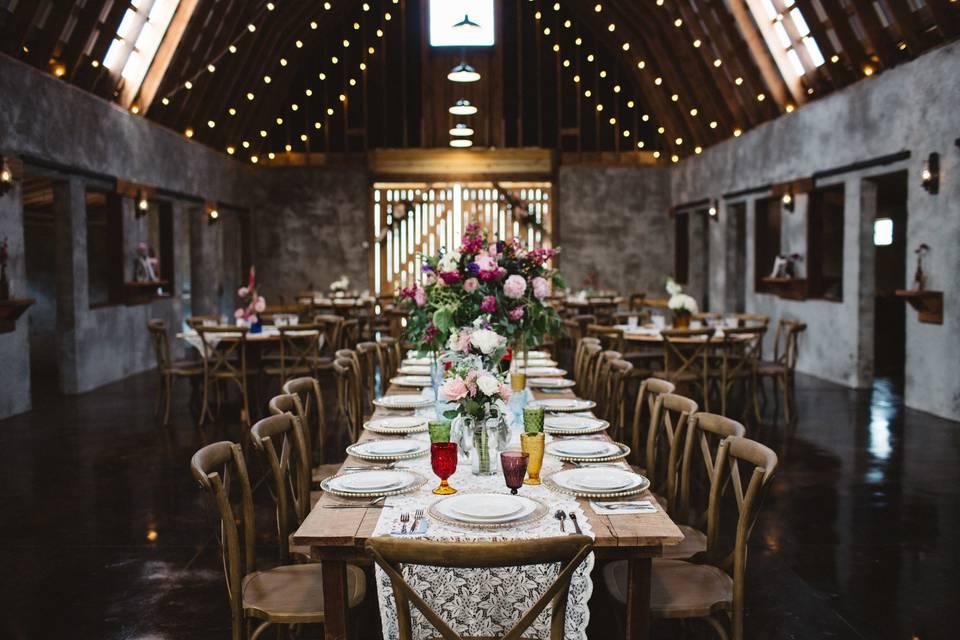 The Overlook Barn sits atop of Beech Mountain, NC and has expansive views of the Blue Ridge Mountains. The barn itself spans over 6,500 square feet. When you walk in, you first are awestruck by the 30-foot arched ceilings with exposed wood beams. The Overlook Barn was fully renovated in 2015 with brides and grooms in mind. It is the epitome of rustic elegance. The Overlook Barn can accommodate over 250 guests for a seated dinner indoors and even more for a tented event.