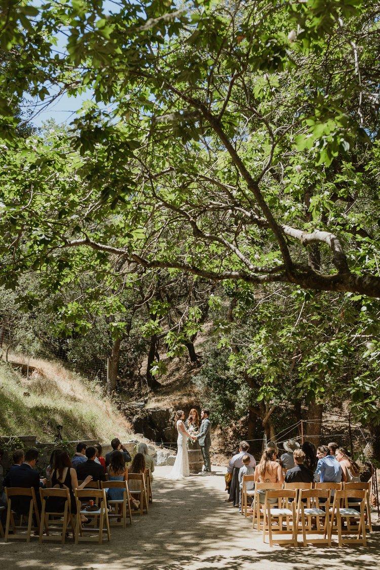 Spread throughout the bucolic grounds are five distinctly beautiful event sites. The first, near the entrance, features two large olive trees that frame the ceremony, while a second boasts an expansive lawn with an old-growth redwood tree as a focal point. Both of these include a wide variety of foliage as well as vineyard views. If you want a more elevated perspective, head a bit higher in the hills where you can overlook the vineyards … or, say “I do” at their newest hillside locale and enjoy the soothing sounds of a natural waterfall. Finally, for something quite different, cross their creek via a wooden bridge to a secluded spot with a fluttery Bay tree and a profusion of greenery.