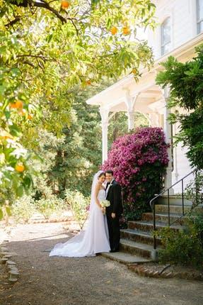 A gentle sloping drive, lined with mature oaks, heirloom citrus trees, and Italian cypress, leads up to the two-story Italianate ranch house. Built in 1876 by a master shipbuilder, it includes Victorian touches like a columned covered porch, decorative eaves, a pergola draped in wisteria, and a fragrant rose garden. It’s ideal for welcoming guests with a cool drink, and it’s also incredibly photogenic. In fact, great photo ops are everywhere, from group pix on the staircase inside to couple shots against a backdrop of antique outbuildings or in the vineyard itself. The winery’s centrally located, spacious outdoor reception area feels quite magical with spotlights tucked in the tall trees. Add a tent if you like, or host up to 200 for cocktails and dinner al fresco. Then dance for hours under the stars since amplified music is allowed until midnight!