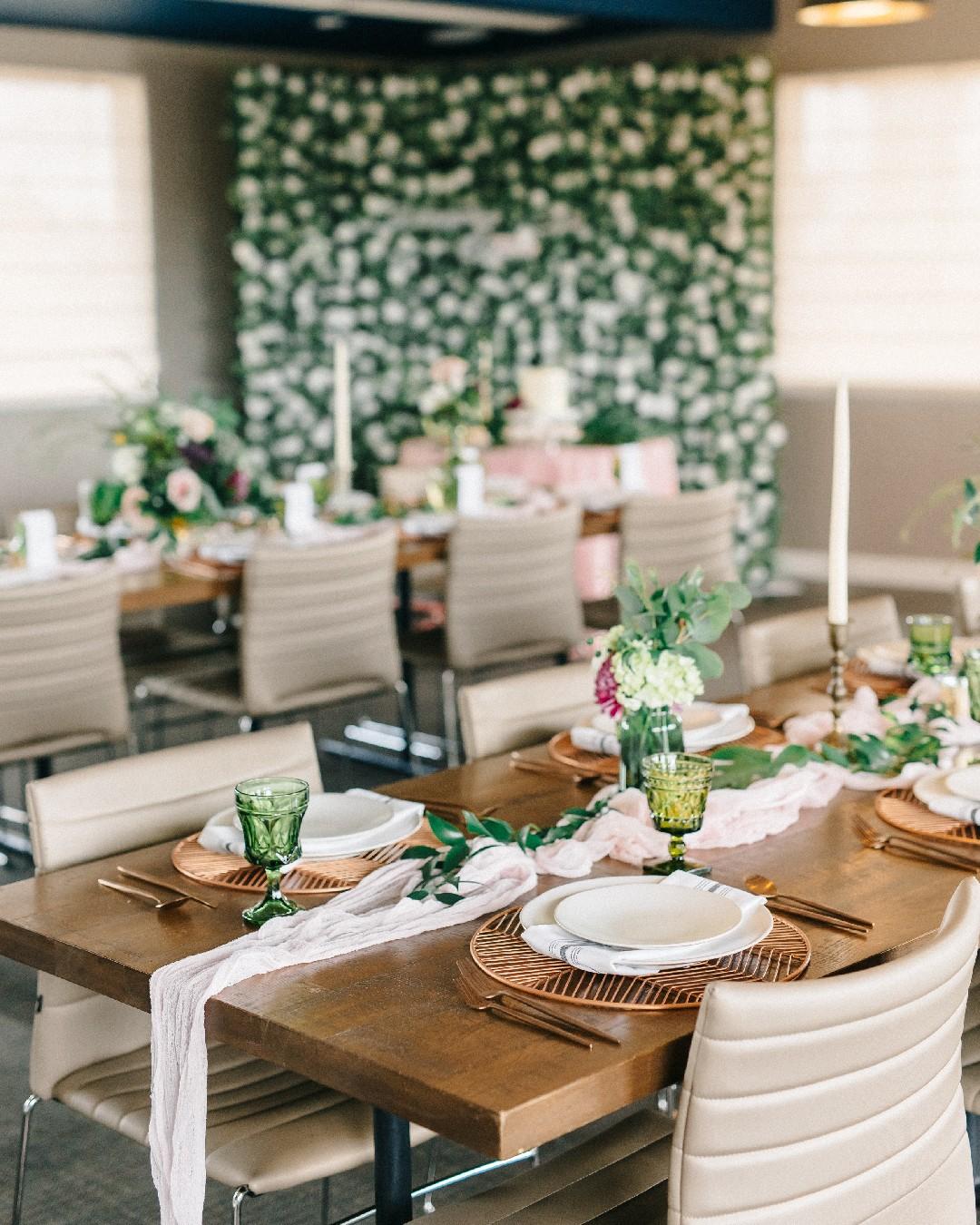 - wood table and chairs (no linen) - flatware, plateware, glassware, linen napkins - full service built in bar