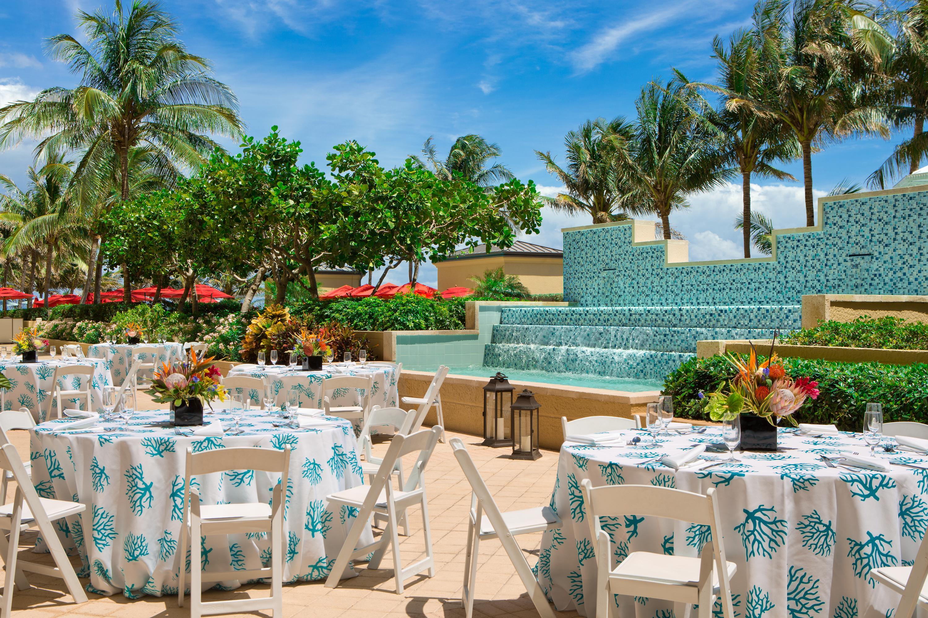 For an intimate dinner or reception of up to 125 guests, the Veranda is the perfect choice for your Singer Island beachfront event. This area can also be used to enhance your ballroom wedding reception by having cocktails on the outdoor Veranda. It's a covered, elegant location that includes surrounding fountains, views of the gazebo, and lush tropical landscaping.