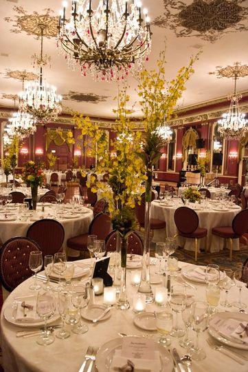Two complimentary changing rooms for the bridal attendants. Generously sized round tables that seat 10, unless otherwise noted.Your choice of satin lamour floor length table linens. If desired, alternative linens are available at an additional charge. Framed table numbers in gold or silver, personalized menu cards at each place setting, and more.