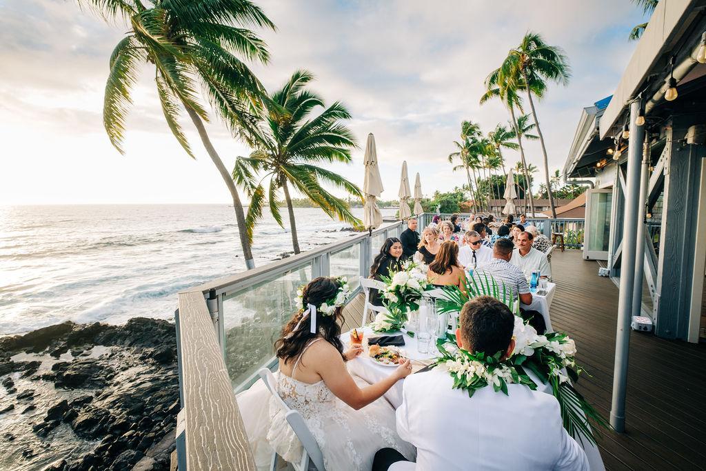 Celebrate your love story right on the ocean at Papa Kona Events, perched above the iconic Papa Kona Restaurant & Bar in the heart of Kailua-Kona. Our private upstairs venue overlooks the sparkling Pacific with wraparound ocean views, tropical breezes, and stunning sunsets. We make planning easy — from custom menus and bar service to coordination and setup, our team handles every detail with aloha so you can truly enjoy your day. Ceremony on the lawn, cocktails at sunset, dinner under the stars — all in one unforgettable location. All-in-one venue: Ceremony, cocktail hour, and reception in one oceanfront location. Incredible views: Panoramic water views, colorful sunsets, and breezy island vibes. Full-service experience: In-house catering, bar, staff, and coordination included. Party-ready: No sound curfew — celebrate into the night with your favorite people. Easy guest access: Parking garage and elevator just steps from the venue.