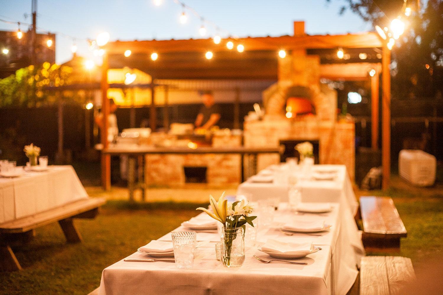 The venue itself is an outdoor secret garden space that features baby pygmy goats, woodfire oven, picnic tables and benches, festoon string lights, tiki torches, handcrafted bar, and built restrooms. The planning and coordination staff will also provide you and your event with all the amenities you need. Chef Pat makes culinary magic happen, creating one of a kind menus by utilizing fresh garden ingredients prepared on the wood-fired oven & grill.
